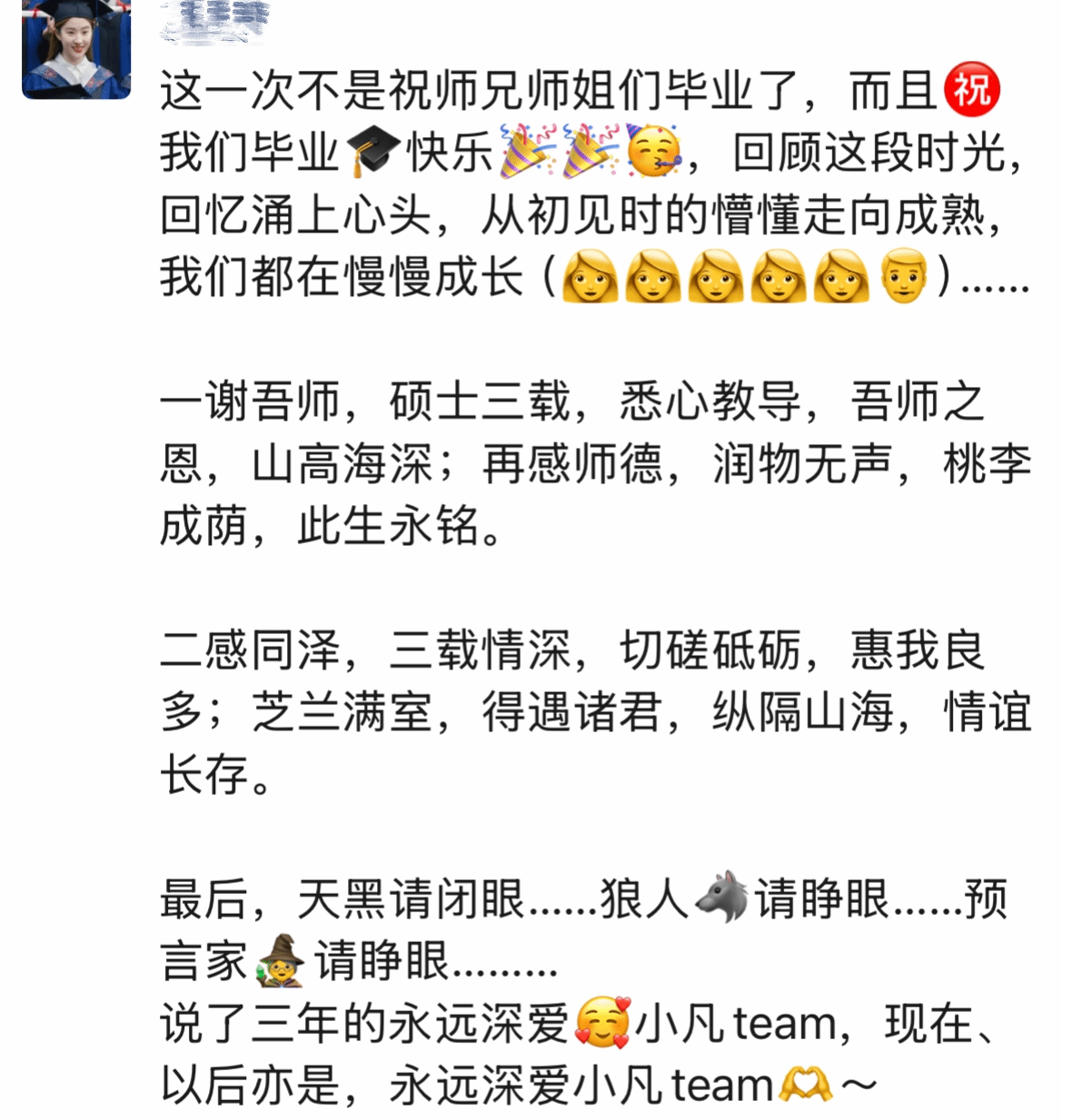 毕业快乐"终于轮到我们说。从初见时的拘谨到成为家人,狼人杀、改代码、深夜外卖都是温暖的记忆。