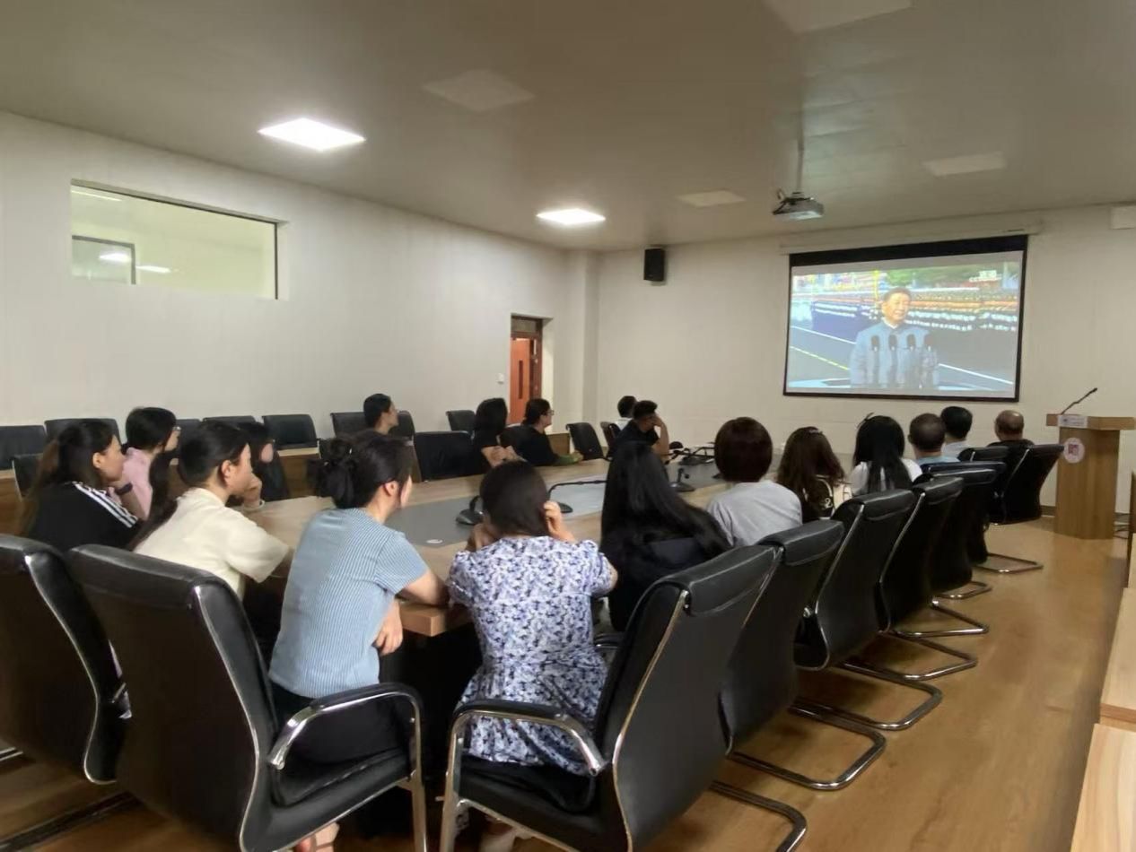 9时整,阅兵正式开始。现场人员全神贯注观看直播,跟随镜头重温中国人民浴血奋战的抗战历程,感受新时代中国军队的威武雄姿。当国旗护卫队迈着铿锵步伐入场,当受阅方阵以整齐划一的队列通过天安门时,会场响起阵阵掌声,老师们为祖国的强大和民族的复兴深感自豪。