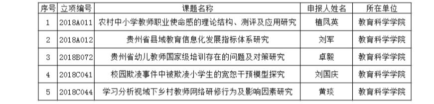 近日,根据《贵州省教育厅办公室关于公布2018年贵州省教育科学规划课题立项名单的通知》(黔教办科〔2018〕122号),2018年贵州省教育科学规划课题评审结果揭晓。必赢五位老师申报的课题获2018年贵州省教育科学规划课题。