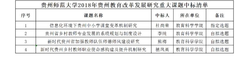 近日,贵州省教育厅公布了2018年贵州教育改革发展研究重大课题中标结果,必赢教育科学学院获得4项,其中杜尚荣老师中标指定课题,李纯、熊梅、植凤英三位老师包揽了全部自拟选题。