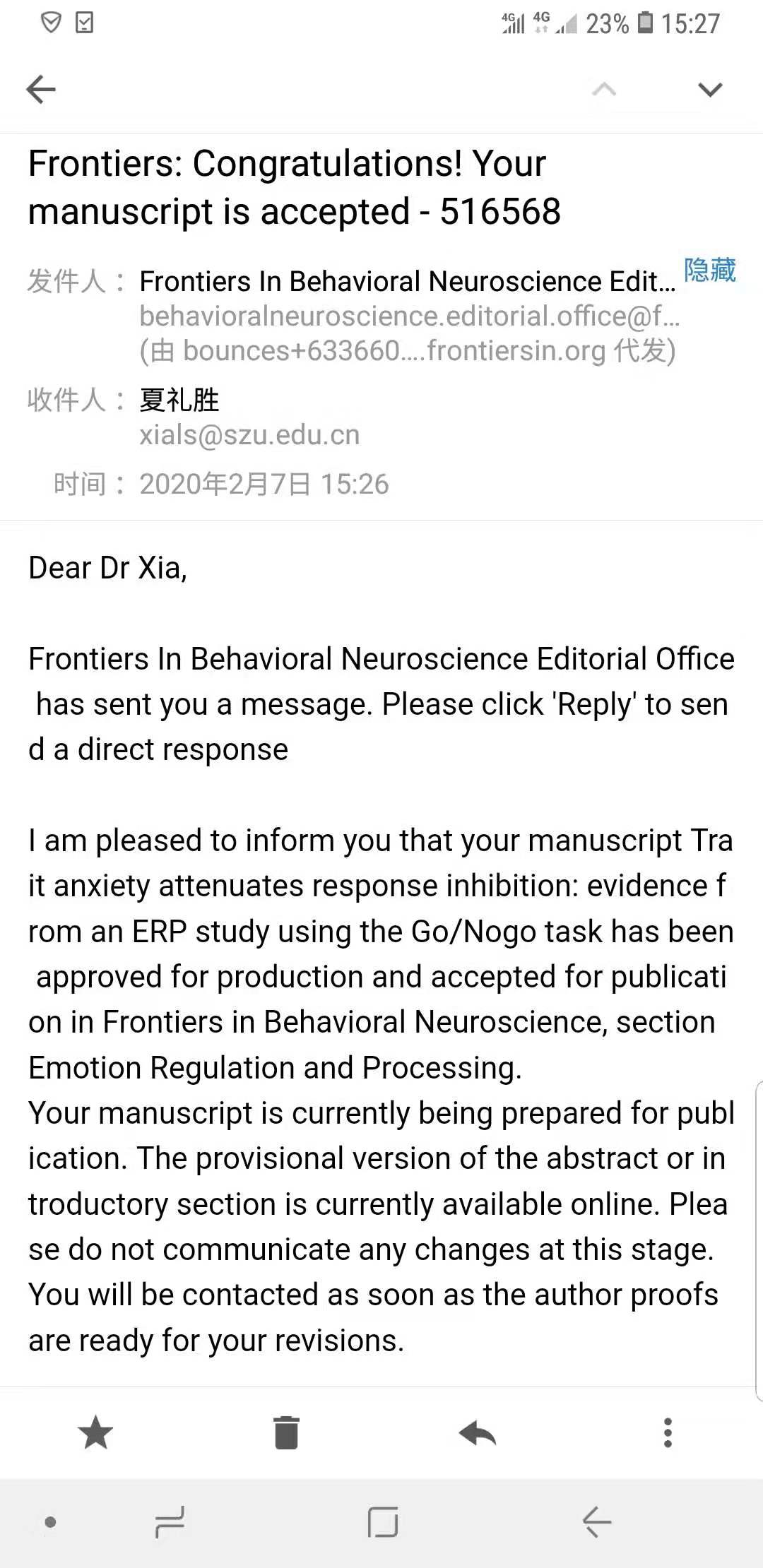 祝贺夏礼胜老师的文章被Frontiers in Behavioral Neuroscience(SCI中科院三区)正式录用。437ccm必赢国际官网是第一作者单位。