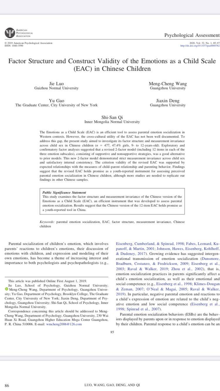 热烈祝贺学院罗杰副教授以第一作者、第一单位在SSCI一区杂志《Psychological Assessment》发表题为“Factor Structure and Construct Validity of the Emotions as a Child Scale (EAC) in Chinese Children”的论文。