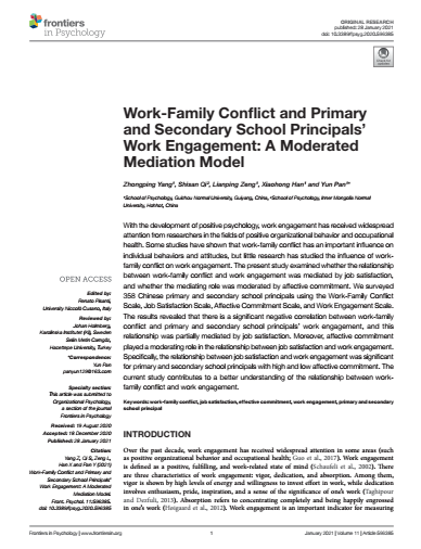 2.2019级博士研究生杨忠萍作为第一作者,潘运教授作为通讯作者,在SSCI二区期刊《Frontiers in Psychology》发表了题为“Work-Family Conflict and Primary and Secondary School Principals’Work Engagement: A Moderated Mediation Model”的学术论文。