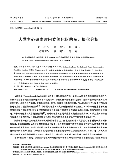 7.罗杰副教授作为第一作者,程刚副教授作为通讯作者,在核心期刊《西南大学学报》自然科学版,发表了题为“大学生心理素质问卷简化版的多元概化分析”的学术论文。