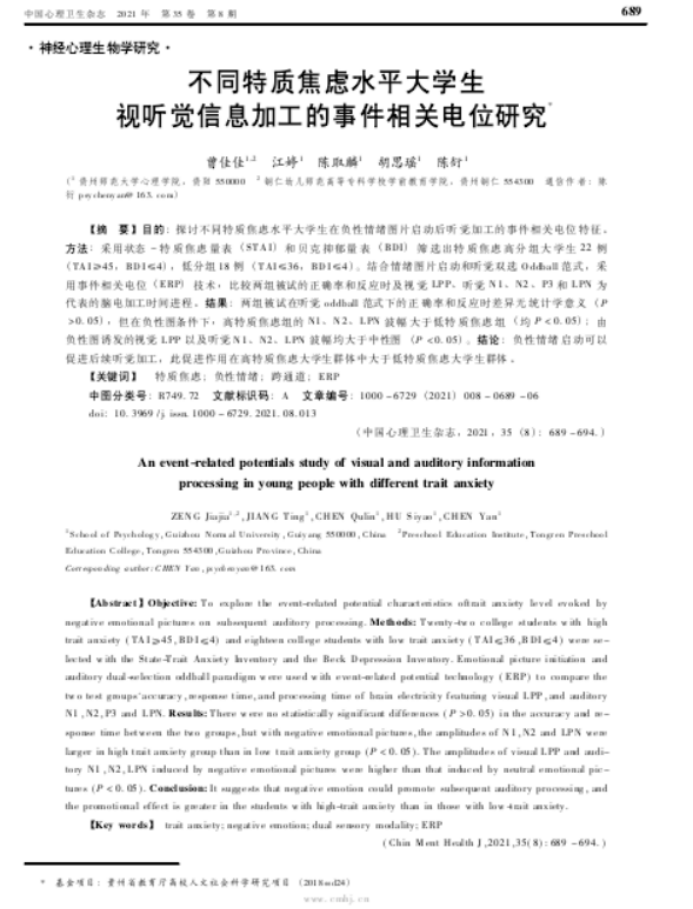 12.陈衍副教授作为通讯作者,2021年7月在CSCD期刊《中国心理卫生杂志》发表了题为“不同特质焦虑水平大学生视听觉信息加工的事件相关电位研究”的学术论文。