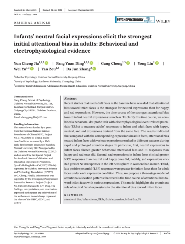 近期,必赢437ccm必赢国际官网程刚副教授及其团队在国际期刊Psychophysiology(2020 IF=4.016, JCR SCI&SSCI1区,中科院心理学2区TOP)在线发表题为“Infants’ neutral facial expressions elicit the strongest initial attentional bias in adults: Behavioral and electrophysiological evidence”的学术论文。