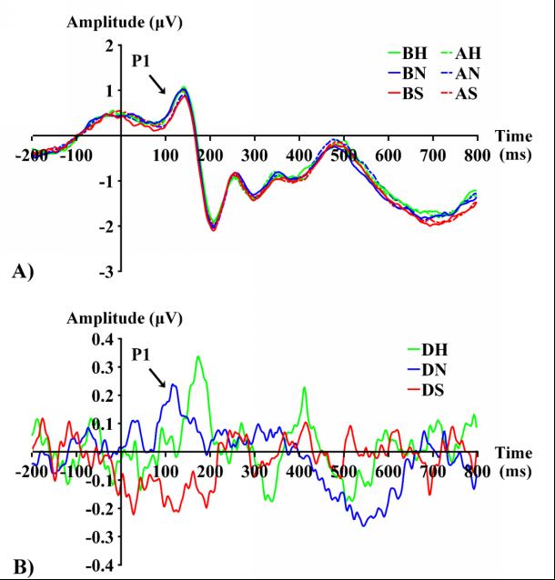 图2 婴儿和成人面孔在高兴、中性或悲伤表情上诱发的P1成分(PO7、PO3、PO4和PO8电极在100~160毫秒时间窗内的平均振幅)的组平均事件相关电位波形