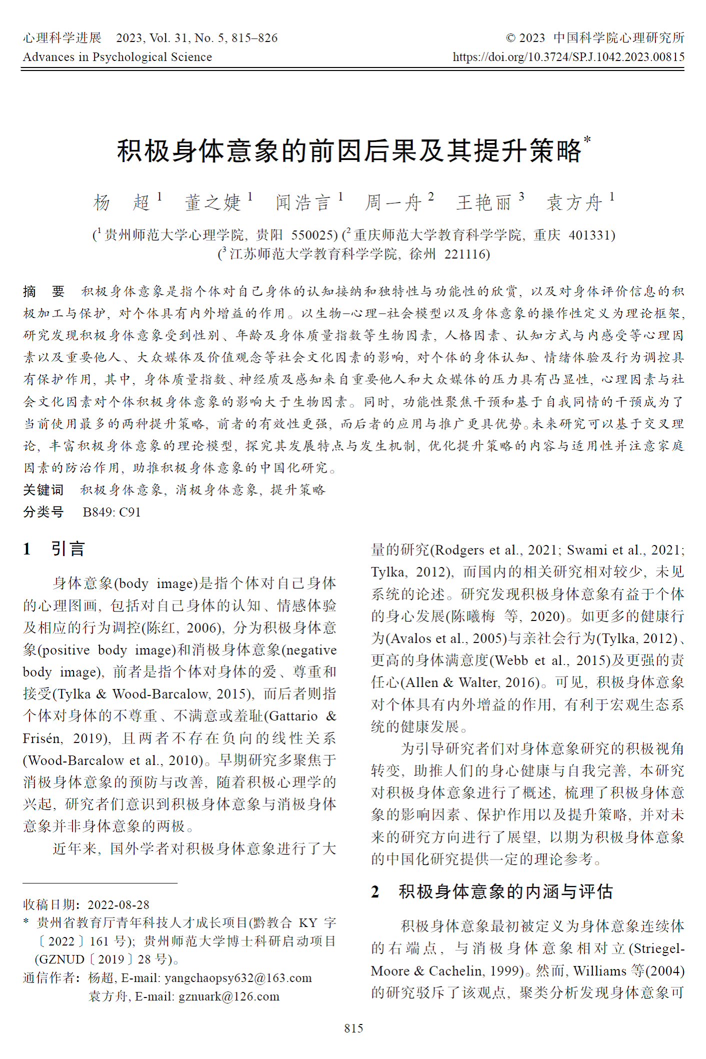 6. 杨超副教授作为第一作者和通讯作者,袁方舟副教授作为通讯作者,2023年2月在CSSCI期刊《心理科学进展》发表了题为“积极身体意象的前因后果及其提升策略”的学术论文。研究对积极身体意象相关文献进行了全面系统的分析和总结。