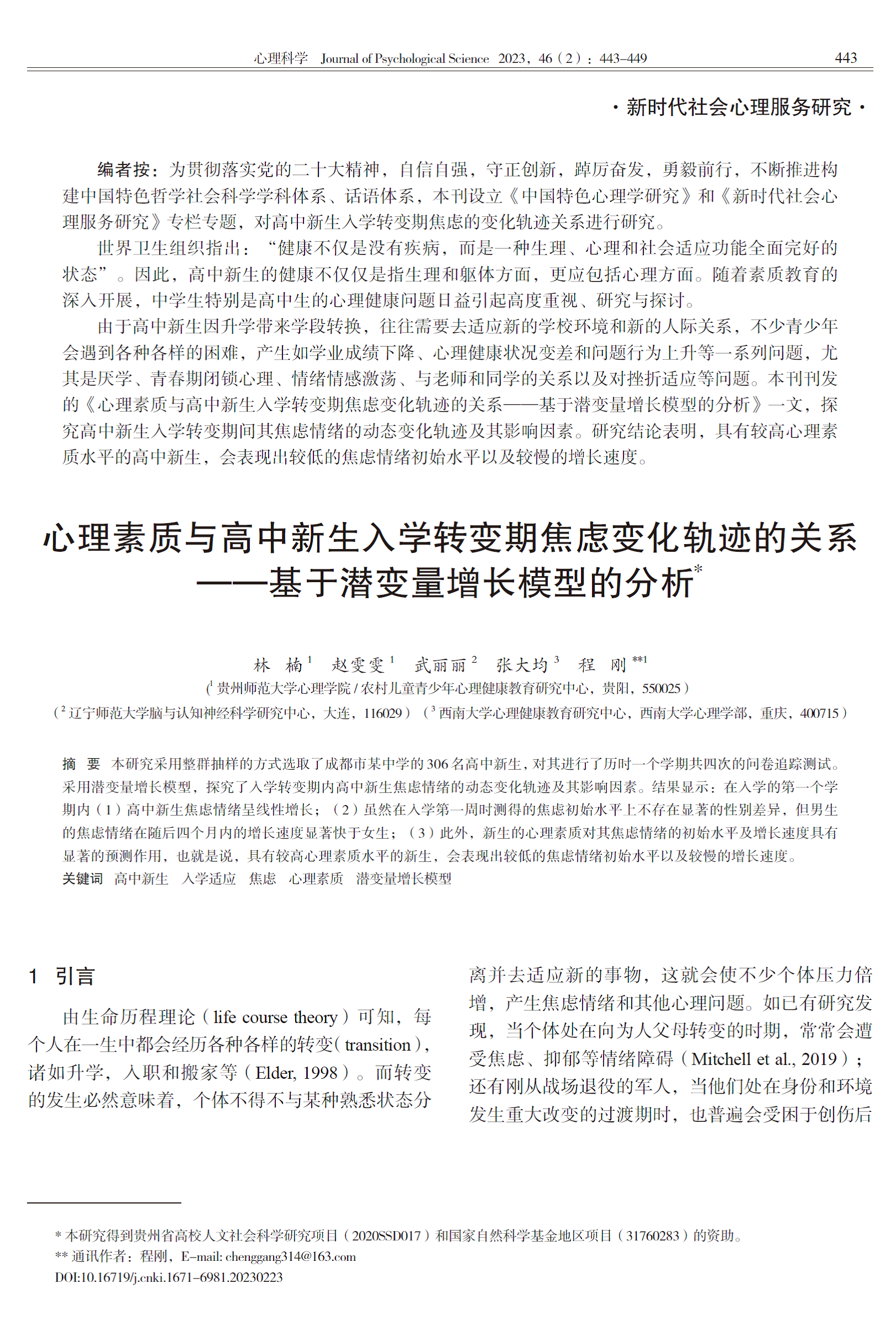 5. 研究生林楠作为第一作者,程刚教授作为通讯作者,2023年3月在CSSCI期刊《心理科学》发表了题为“心理素质与高中新生入学转变期焦虑变化轨迹的关系——基于潜变量增长模型的分析”的学术论文。研究揭示了入学转变期内高中新生焦虑情绪的动态变化轨迹及其影响因素。