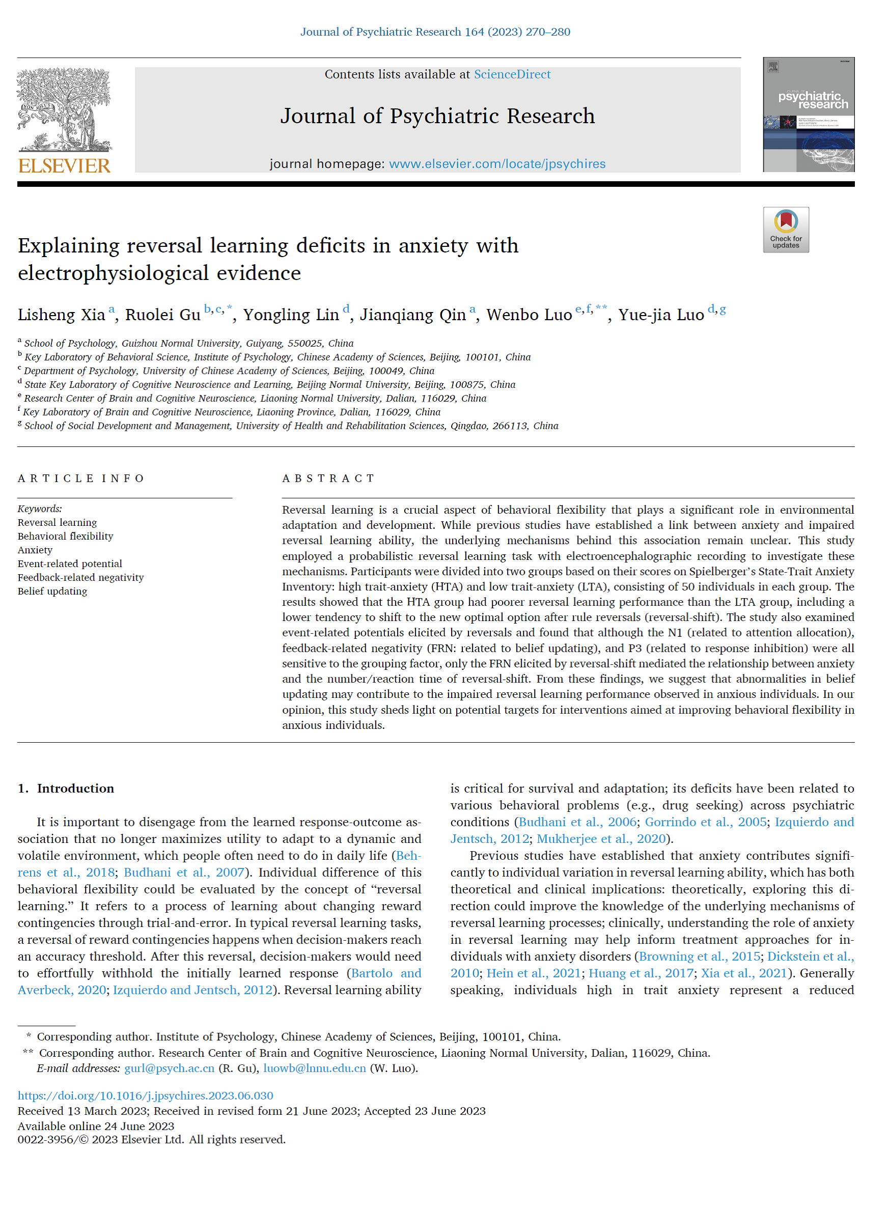 1. 夏礼胜副教授作为第一作者,2023年6月在SCI JCR二区期刊《Journal of Psychiatric Research》发表了题为“Explaining reversal learning deficits in anxiety with electrophysiological evidence”的学术论文。研究采用概率性逆转学习任务和事件相关电位技术,探究了焦虑和逆转学习能力受损之间的联系,及这种联系背后的电生理学机制。