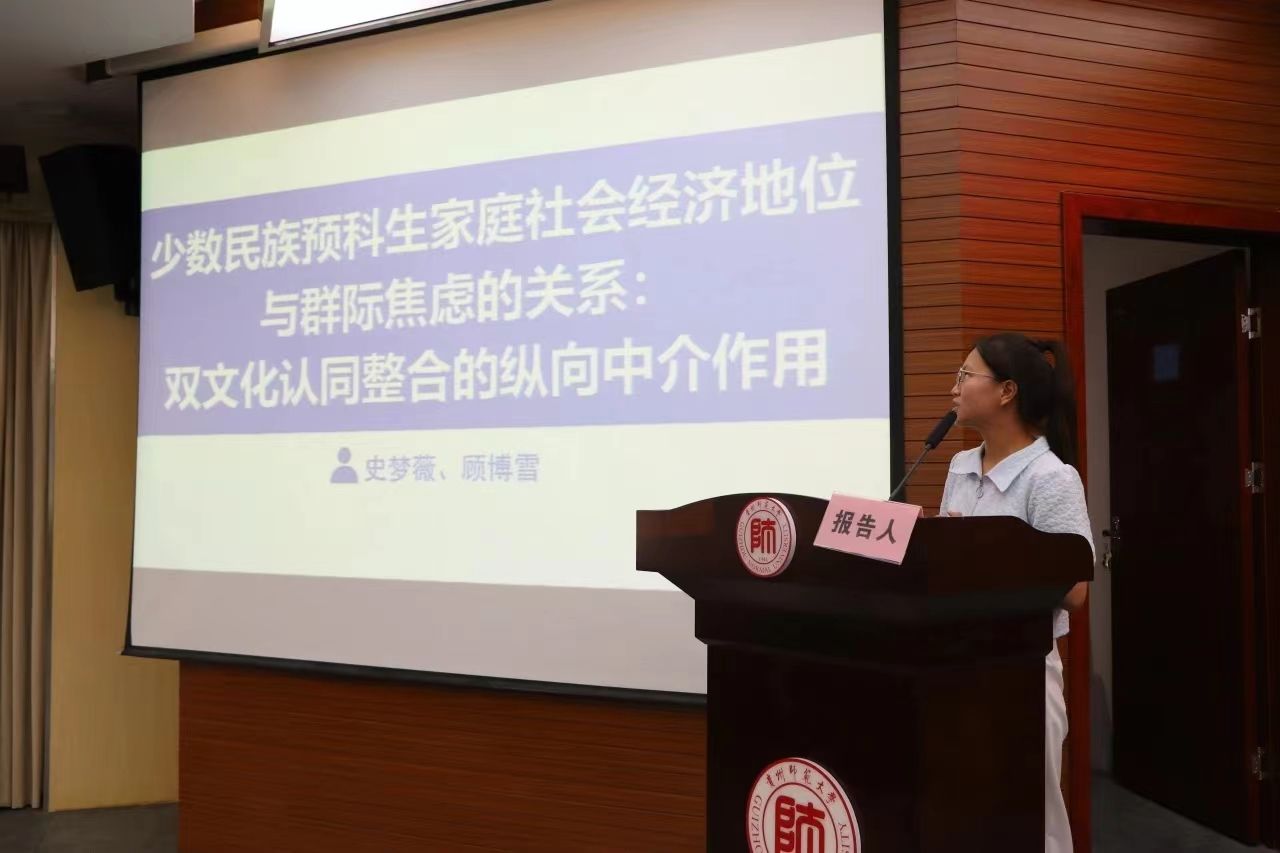 437ccm必赢国际官网本科生顾博雪分享了其导师史梦薇副教授的报告,《少数民族预科生家庭社会经济地位与群际焦虑的关系:双文化认同整合的纵向中介作用》,通过一学期前、中、末三次取样的追踪研究设计,发现少数民族预科生的家庭经济社会地位不仅能够直接预测期末的群际焦虑,还能通过期中的双文化认同整合间接预测期末的群际焦虑水平。