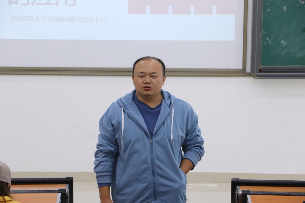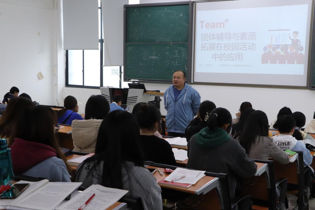 首先,郑传章为同学们进行团体辅导理论知识的讲解,他详细介绍了各种团辅游戏及游戏活动对学生成长发展的作用意义,并邀请同学们上台做演示,进一步指导他们如何开展团辅活动,同时通过播放团辅和素拓的视频让大家借鉴学习。