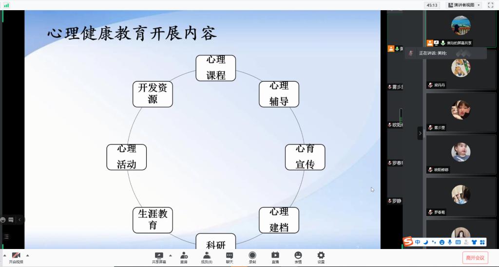 这一环节中,美玲老师给大家介绍了心理健康教育开展的内容,即心理老师在学校的常规工作。包括八个方面的内容:心理课程、心理辅导、心育宣传、心理建档、科研、生涯教育、心理活动、开发资源。