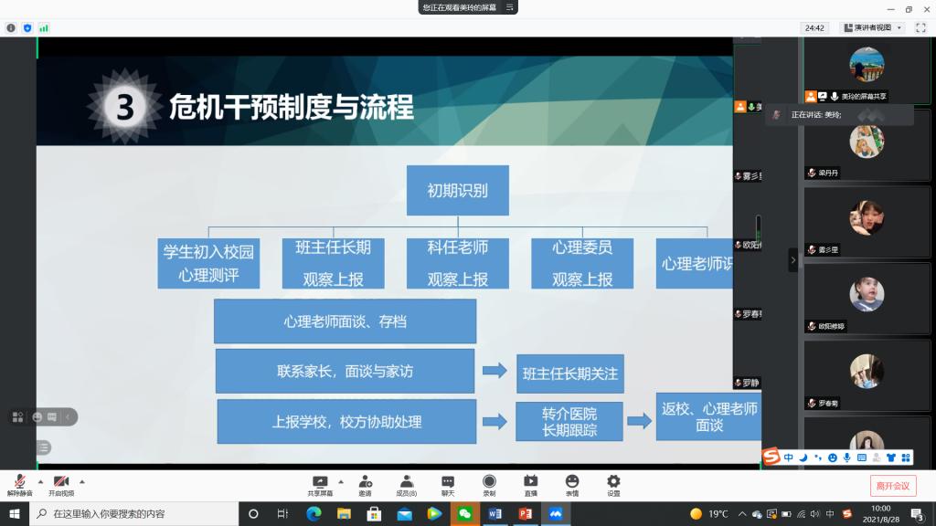 8月28日9:30,美玲老师与第三组成员通过线上腾讯会议开展了第四次会议,会议主要内容有:教案打磨、危机干预制度与流程分享、心理老师工作介绍、班主任工作经验分享。
