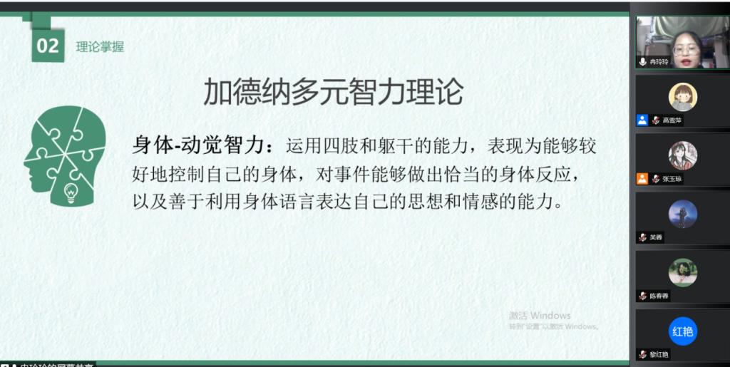 冉玲玲:1.导入部分不是很好,一开始就讲人物激发不起学生的兴趣可以考虑把杯水与曲别针的活动作为导入活动;2.在加德纳的多元智力理论讲解部分,理论性的知识太多,可以选择耳熟能详的案例为切入点来讲解理论。