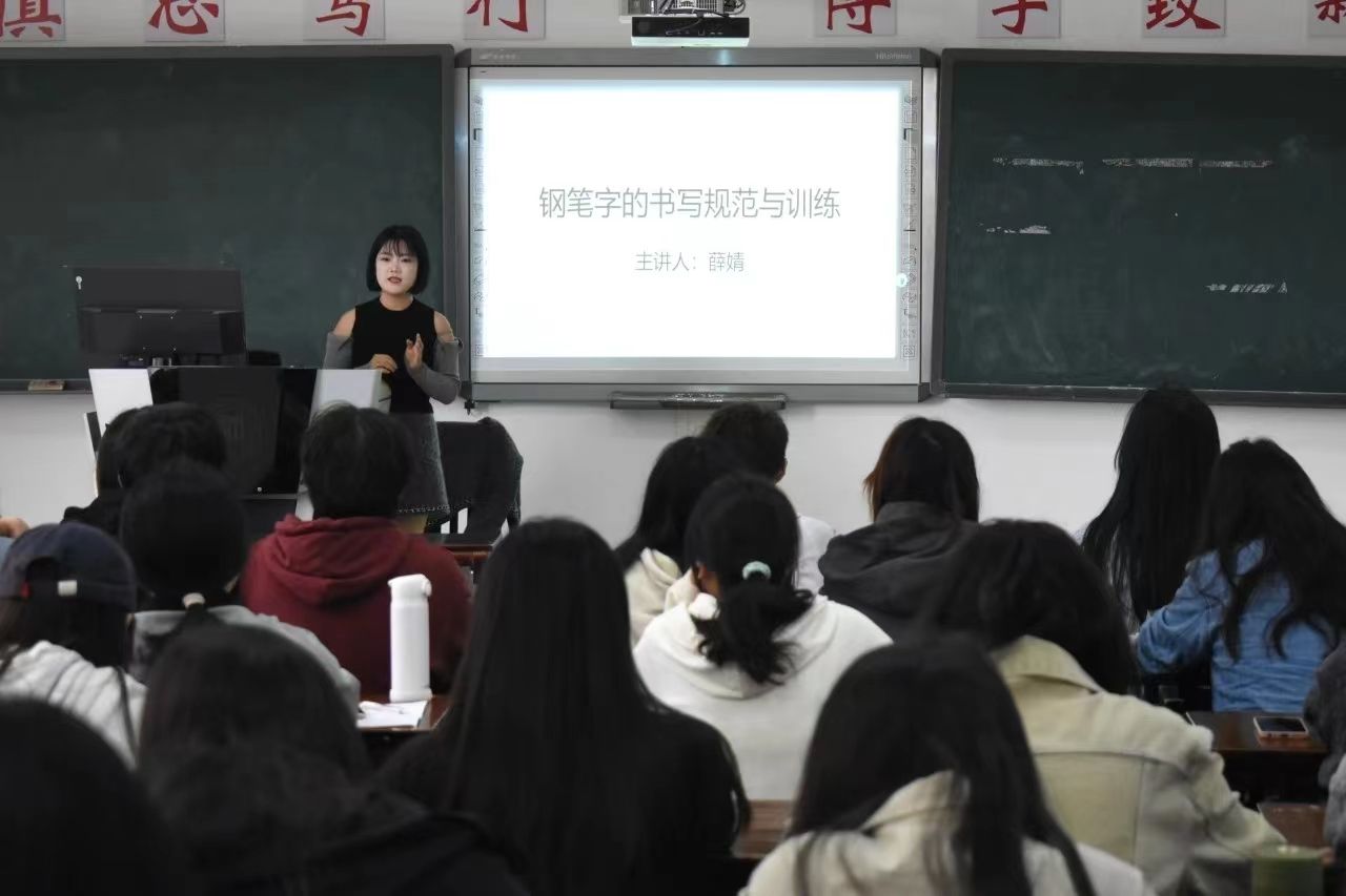 上午,薛婧以提出疑问的方式为2021级学生导入本课内容,她提问大家所熟知的钢笔品牌有哪些,而后从钢笔的试用、不同类型的钢笔的优缺点两方面为大家详细讲解了怎样选好钢笔。她强调,不同的钢笔有不同的适配墨水。接着她为大家讲解了墨汁的选择要注意干燥性,饱和度,洇染程度,硬度,流动性,气味,色泽等方面。对于如何练好钢笔字,薛婧从学习方法以及钢笔的使用方法两方面进行授课。她强调,临帖要专一,找到自己喜欢的帖子,练到形同神似再博采众长融会贯通才能自成一家。