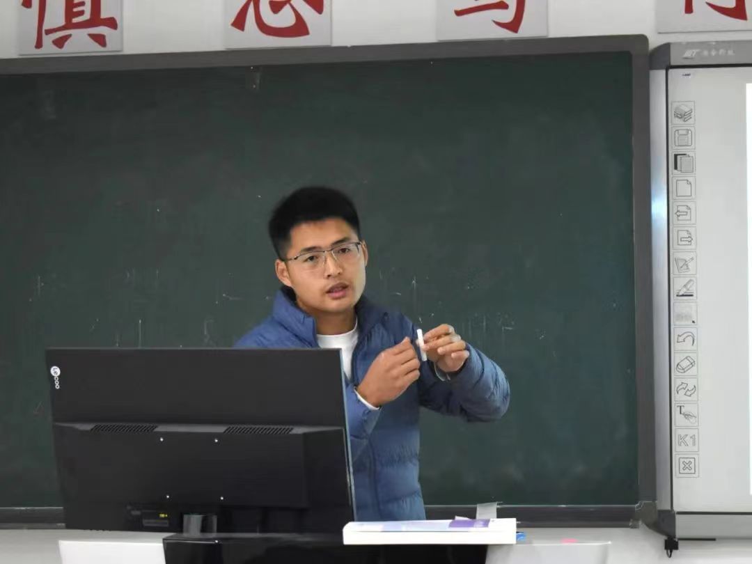 王老师给两个班的同学介绍完正确的握笔姿势后,依次从书写常识、基本笔画的写法和偏旁部首的写法这个三方面向同学们讲解了粉笔字的训练要求练习方法。王老师以李清照的《夏日绝句》为例,选择不同结构的字讲解字体的结构分析,在演示过程中,他强调粉笔字需要布局合理,行列整齐,同时要根据笔画的走向,改变下笔的轻重。