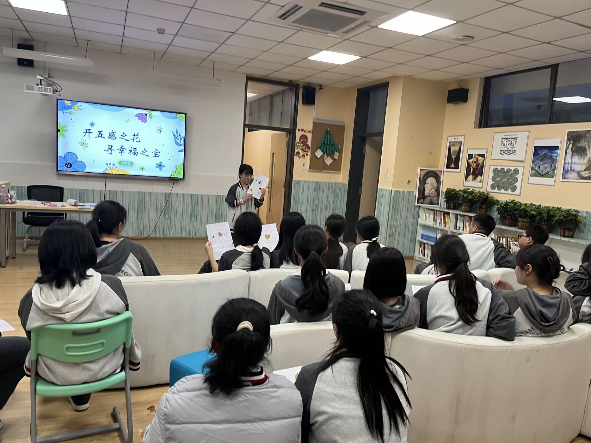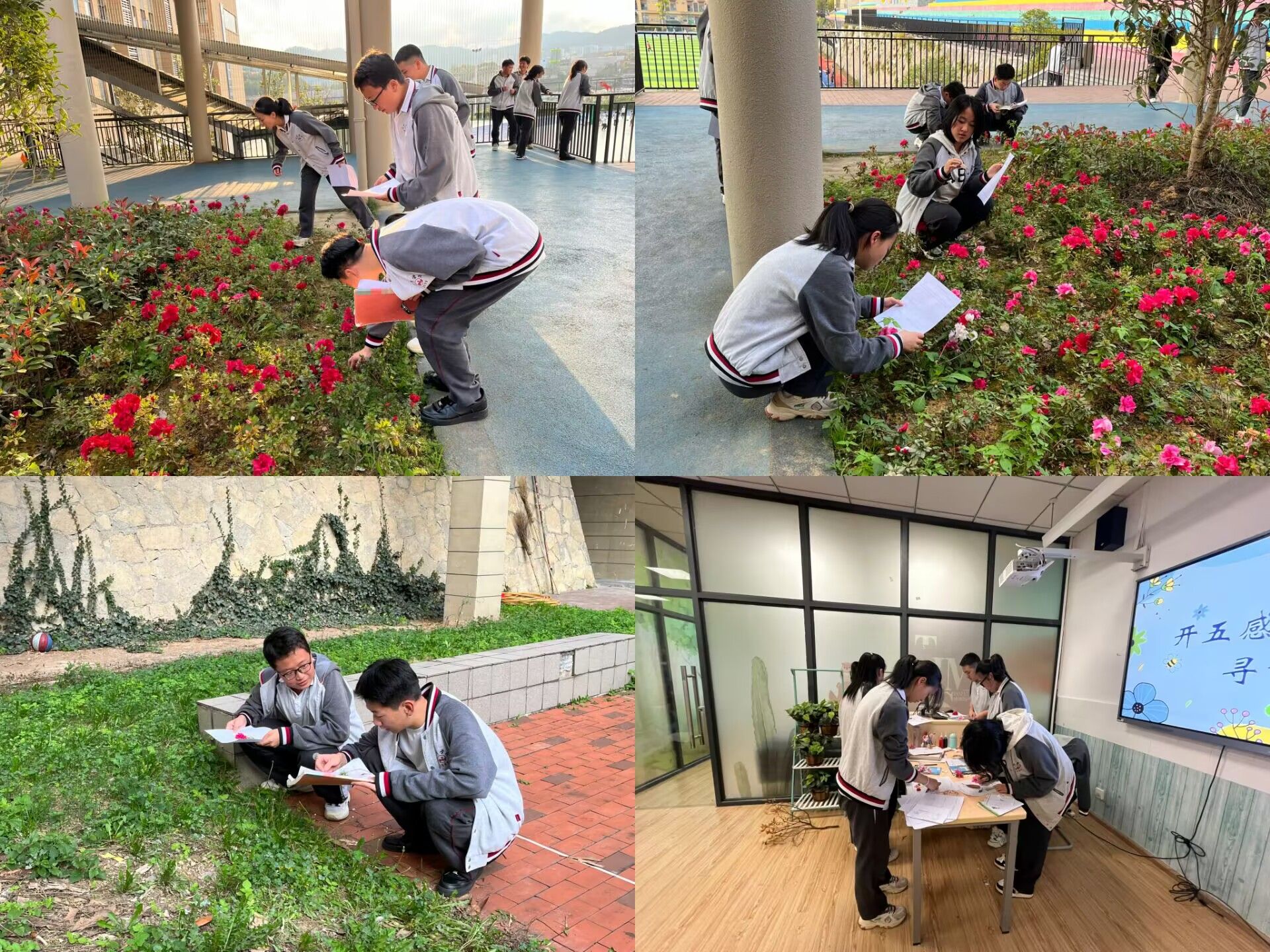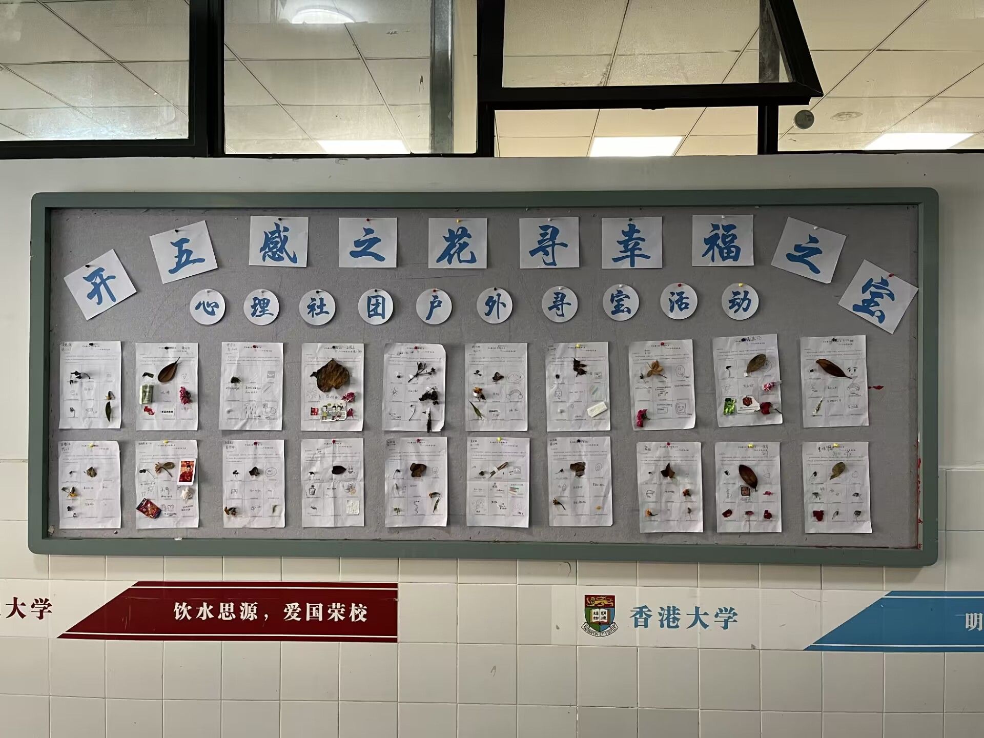 本周社团课由廖晓敏组织进行,主题是“开五感之花 寻幸福之宝”,引导学生带着五感去走进自然,积极觉察身边美好事物,寻找到生活中的“小确幸”,使学生在感受自然、亲近自然、回归自然的同时,也丰富了自己的情感体验,让其体会到了其中的幸福。社团课上完后两位实习生将学生的作品进行整理、挑选,将优秀作品粘贴在高中部教学楼展板上,便于学生参观。