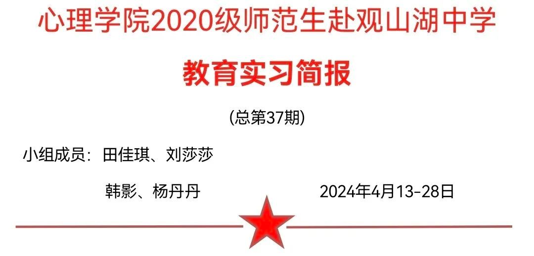 为加强对理解教育理论如何在实践中运用的理解,不断提高自身的专业素养。4月19日,实习生韩影、杨丹丹、刘莎莎、田佳琪一起观摩观山湖中学心理健康老师吴仕敏的心理健康教育课《接纳我自己》,以寻找缺失的“角”为切入点,让学生们去探索真实的自己,接纳不完美的自己。通过“记录不完美的黑点”和“怎样处理黑点”让学生们思考用什么样的态度去面对自己的不足。整堂课程学生们积极参与,氛围活跃。通过本次听课,有助于我们在未来独立授课时更好地规划和执行课程内容,认识到自身的优势和不足,不断优化教学策略。