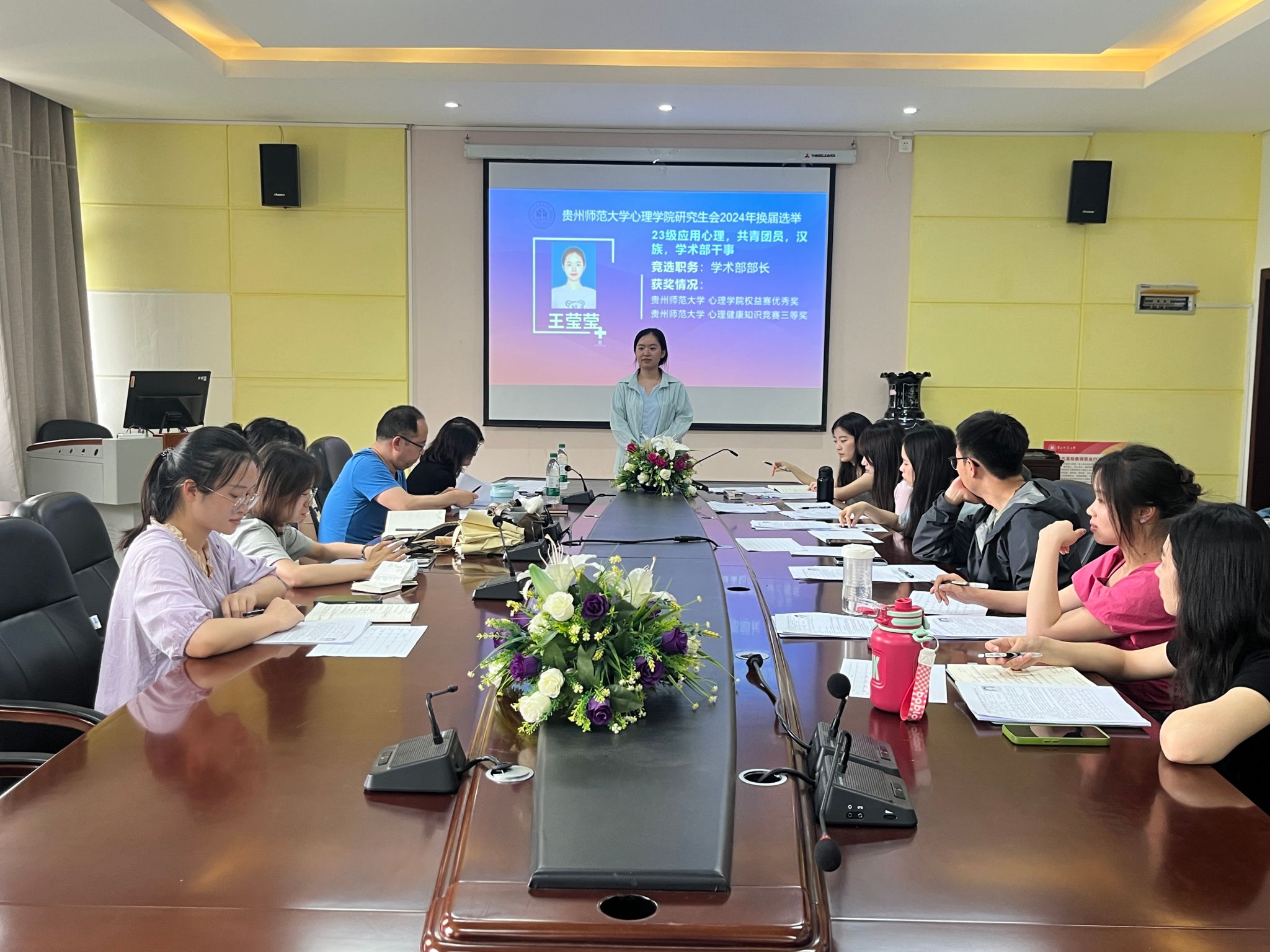 十四位候选人依次进行了竞职陈述。经过前期精心准备,候选人从自我介绍、学生工作经历、个人优势和未来展望等方面充分展示自己,并对评委小组提出的相关问题一一进行了回答。会上,周馨悦回顾了自己在研究生会这一年的成长历程,并对一起并肩作战的同学们表示了深深的感谢,她相信研究生会将在大家的共同努力下迈向更高的台阶。会后,经评委小组认真讨论,秉持着公平公正的原则确定新一届研究生会的人选。