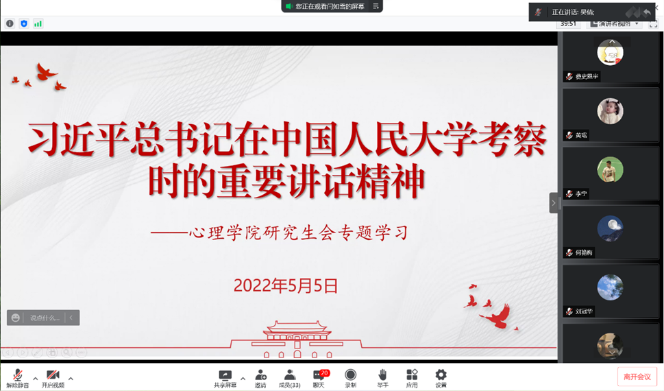 5月5日,437ccm必赢国际官网研究生会采用线上会议的方式,学习习近平总书记在中国人民大学考察时的重要讲话精神,会议由院研究生会主席团成员闫如雪主持,研究生会全体成员参加了会议。
