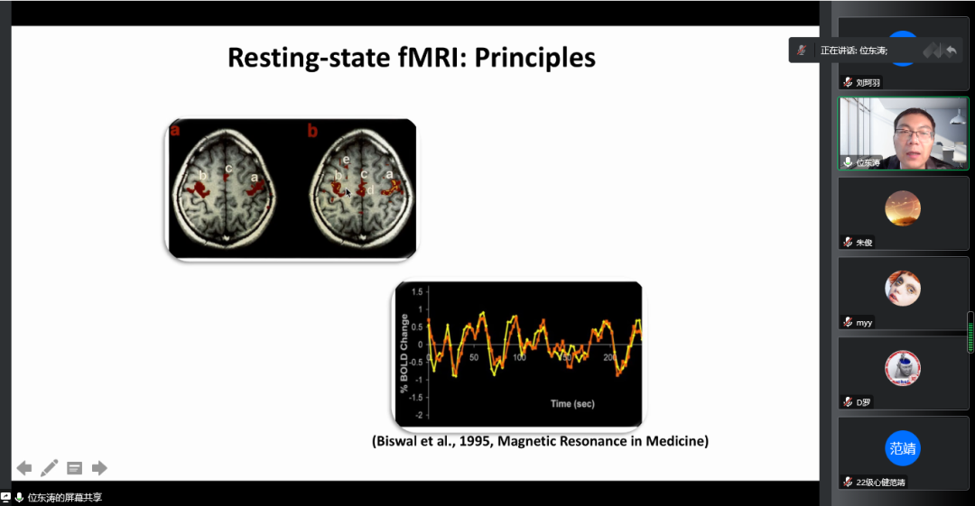 位东涛副教授学术功底深厚,曾多次荣获重庆市级学术荣誉,并以第一作者或通讯作者身份在心理学和认知神经科学杂志上发表十余篇SCI/SSCI。培训中,位东涛副教授用通俗易懂的语言从“基于心理学实验任务的功能磁共振”“静息态功能磁共振”“磁共振结构成像”等方面,详细介绍了功能成像、fMRI实验设计、任务态数据分析进展、rs-fRMRI的研究方法等内容,生动形象地运用图片和详实具体的案例向大家展示当前认知神经科学的前沿研究方法、基本原理,以及研究过程中的常见问题、注意事项和关键节点。