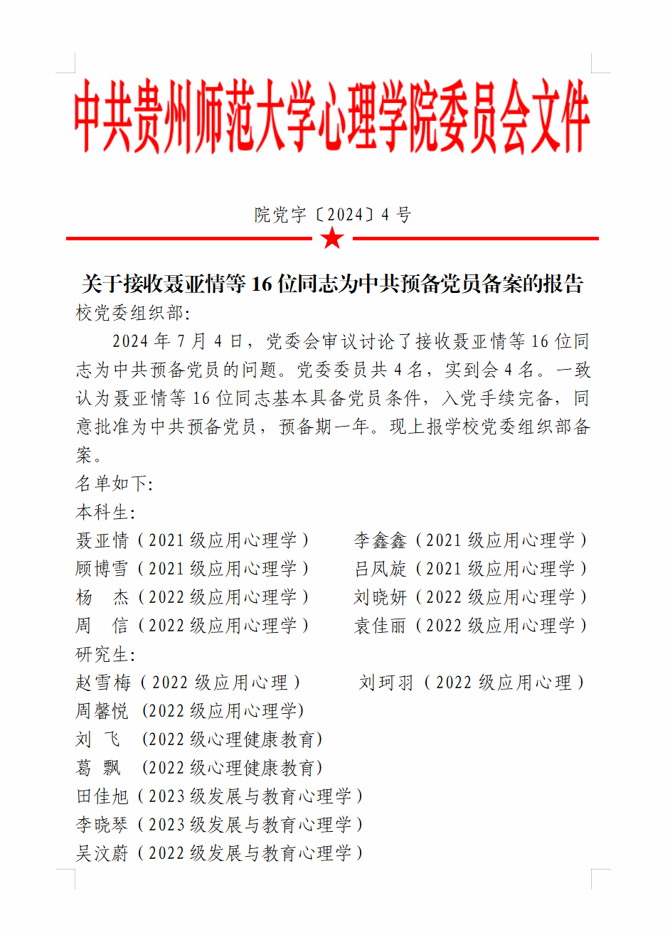 院党字【2024】4号关于接收聂亚情等16位同志为中共预备党员备案的报告