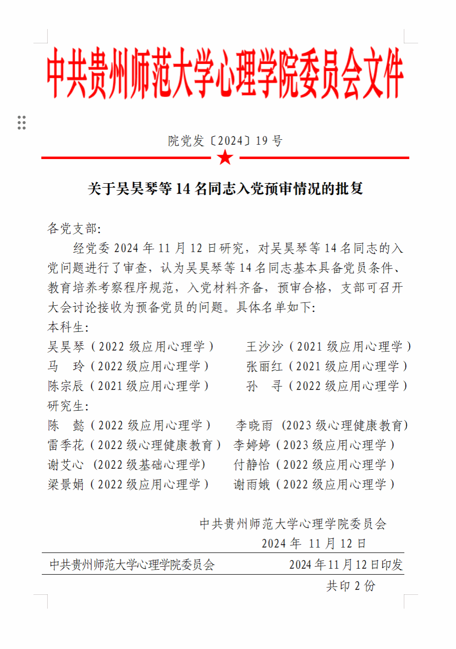 院党发[2024]19号关于吴昊琴等14名同志入党预审情况的批复