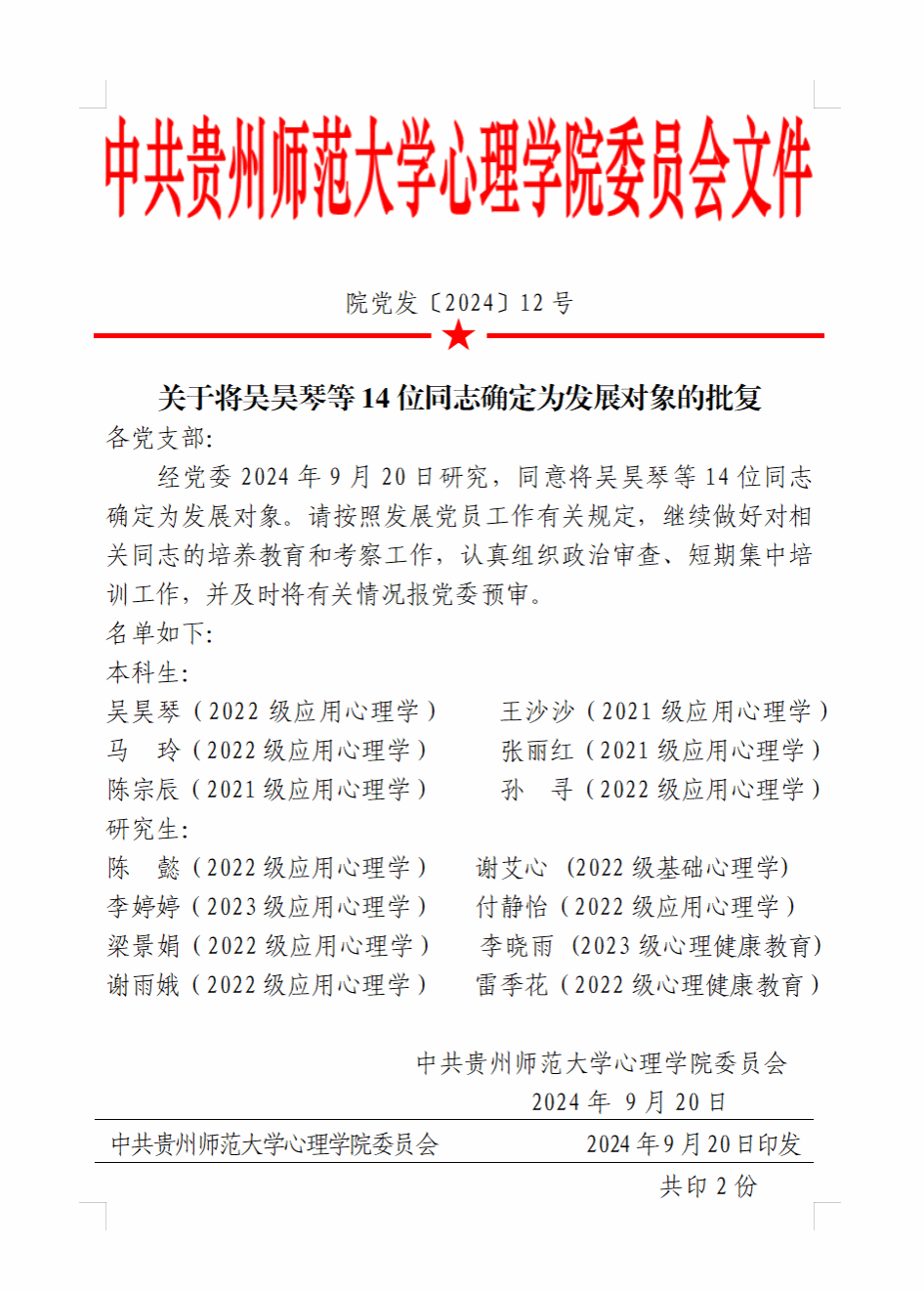 院党发[2024]12号关于将吴昊琴等14位同志确定为发展对象的批复