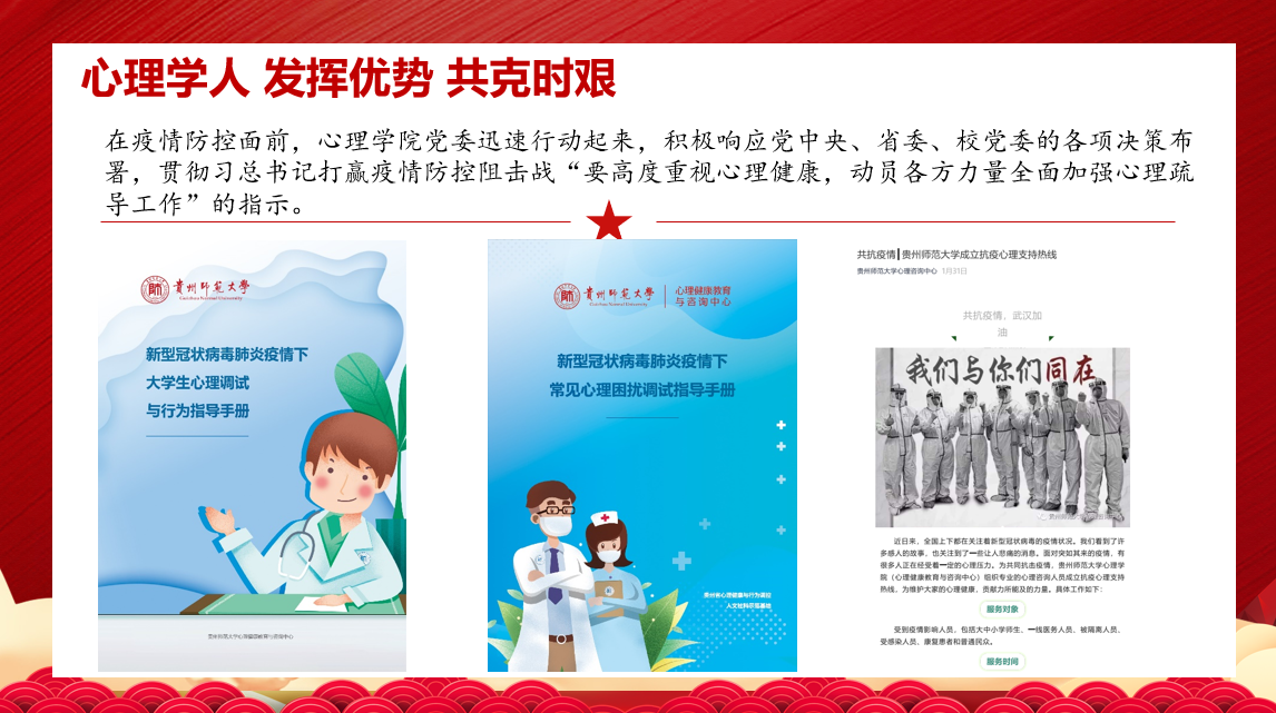 通过回顾疫情以来,437ccm必赢国际官网党委为了筑牢防疫第一线主动作为,发布了《给心灵戴上防护的“口罩” ——致广大师生的一封公开信》,开设心理支持热线、组建“疫情心理健康助力推文工作小组”、开展疫情普查及调研、实施返校学生心理筛查、党员师生主动投身抗疫志愿服务等方面内容,向学院师生全面呈现了心理学人在面对疫情时敢作为、能作为的决心和信心。