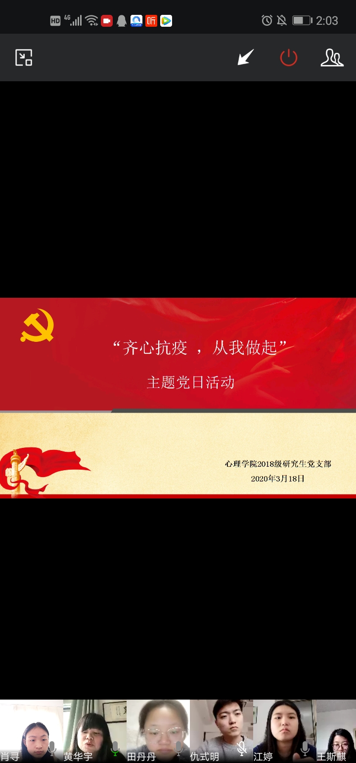 为了进一步贯彻落实习近平总书记对新冠肺炎疫情防控工作的重要指示精神,落实学校和学院党委的决策部署,在特殊时期充分发挥好党支部的战斗堡垒作用,提高学生党员的责任意识、疫情防控意识,激励学生党员在疫情防控阻击战中发挥先锋模范作用,437ccm必赢国际官网2018级研究生党支部于3月18日通过“企业微信”平台视频会议的方式开展了“齐心抗疫、从我做起”主题党日活动。