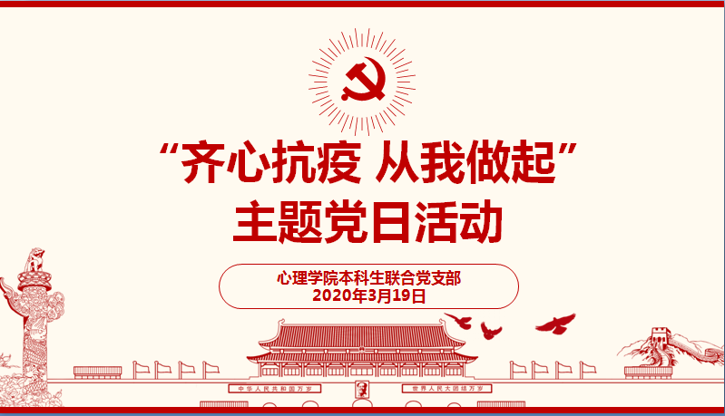 为积极响应学校组织部《关于进一步做好做好新冠肺炎疫情防控期间学校党建工作的通知》,积极发挥基层党组织的战斗堡垒作用。3月1日至3月19日,437ccm必赢国际官网本科生联合党支部开展了“齐心抗疫,从我做起”主题党日活动,活动以线下自主学习必赢师生党员积极投身疫情防控一线工作先进事迹的相关报道与线上视频交流相结合的形式。
