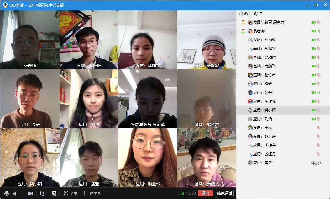 随后,大家围绕本次疫情防控斗争中的先进典型、感人事迹进行分享和学习,并结合近期居家学习生活情况,就个人在疫情期间的所见、所闻、所感轮流开展在线交流。“这次疫情,让我们看到了我国社会主义制度的优越性,感受到了国家对人民生命安全的重视,很庆幸自己身在中国,为自己是中国人而倍感自豪和骄傲。”“疫情发生后,全国各地的医护人员不顾自身安危前往武汉支援,让我们感受到医护人员的伟大,非常感谢医护人员们对这次疫情的付出。”“作为学生党员,利用自己专业特长,编写心理引导方面的书籍,积极贡献着自己的一份力量。”“积极引导家人以及身边的人增强防护意识,站好自己的一班岗,绝不给国家添负担。”……通过交流,支部党员们真挚地表达了对党中央在疫情防控方面各项英明决策的拥护,也表达了对抗疫一线英雄们的敬意,还表达了他们将结合自身专业特长,为祖国和社会积极贡献力量的决心。