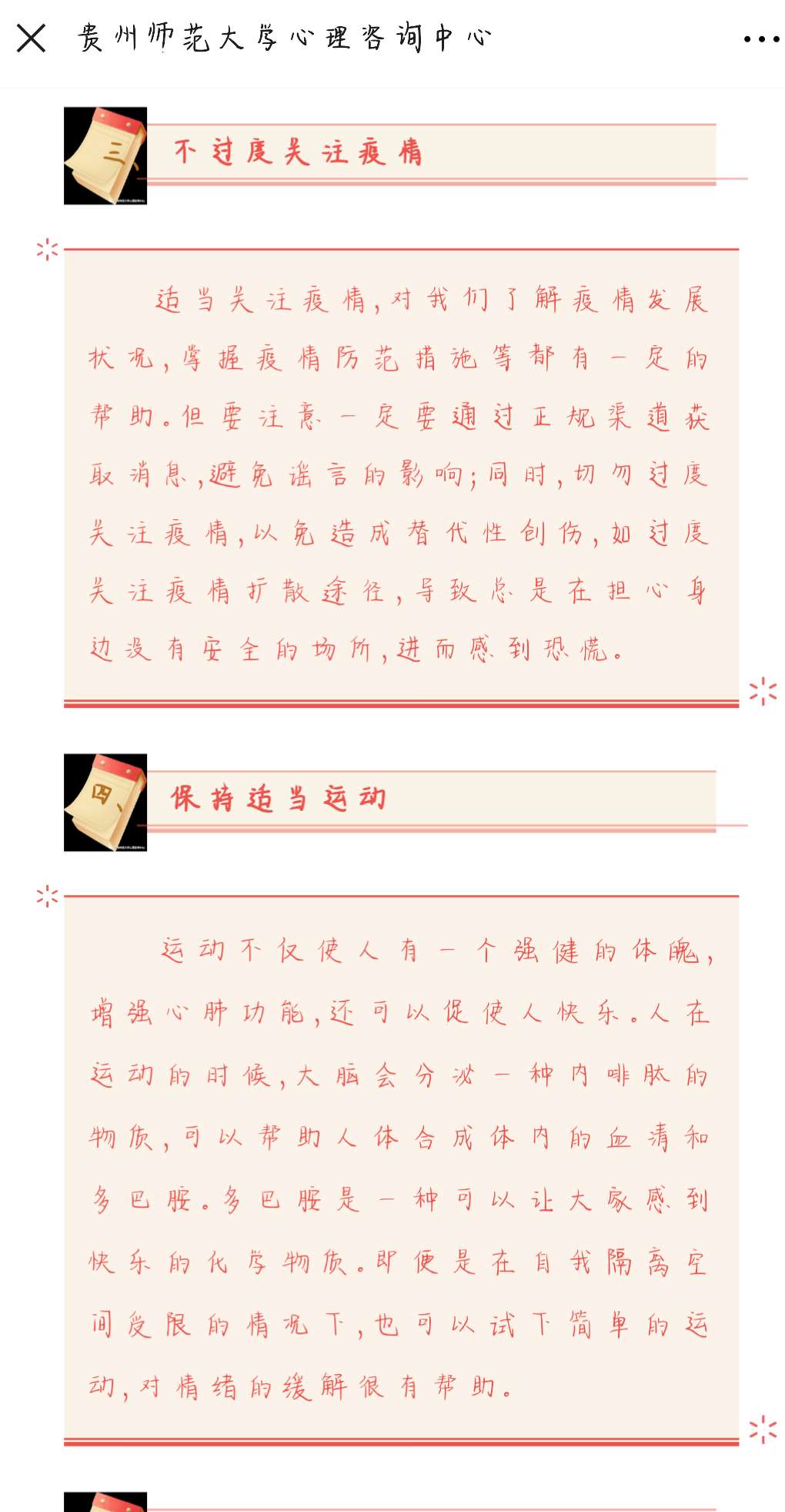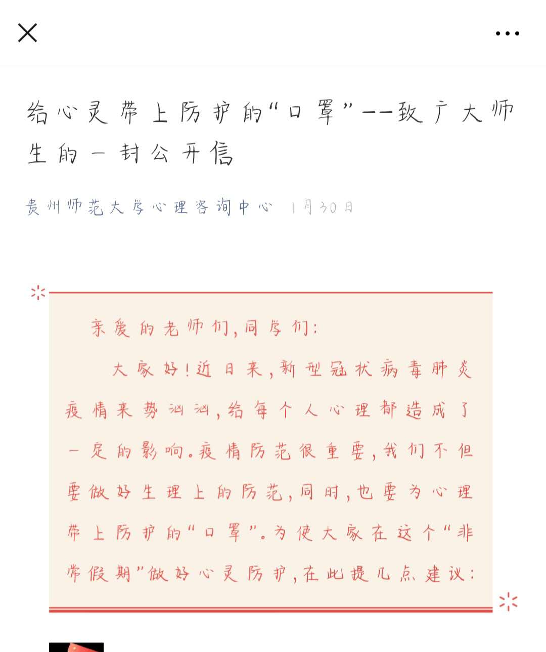 “亲爱的老师们、同学们:大家好!近日来,新型冠状病毒肺炎疫情来势汹汹,给每个人心理都造成了一定影响。疫情防范很重要,我们不但要做好生理上的防范,同时,也要为心理戴上防护的‘口罩’……”这是1月30日,“437ccm必赢国际官网心理咨询中心”微信公众号上发布的《给心灵戴上防护的“口罩” ——致广大师生的一封公开信》一文。该篇文章在短时间内迅速获得了5000余次的阅读量,引发师生们的热议。