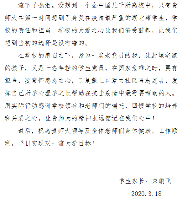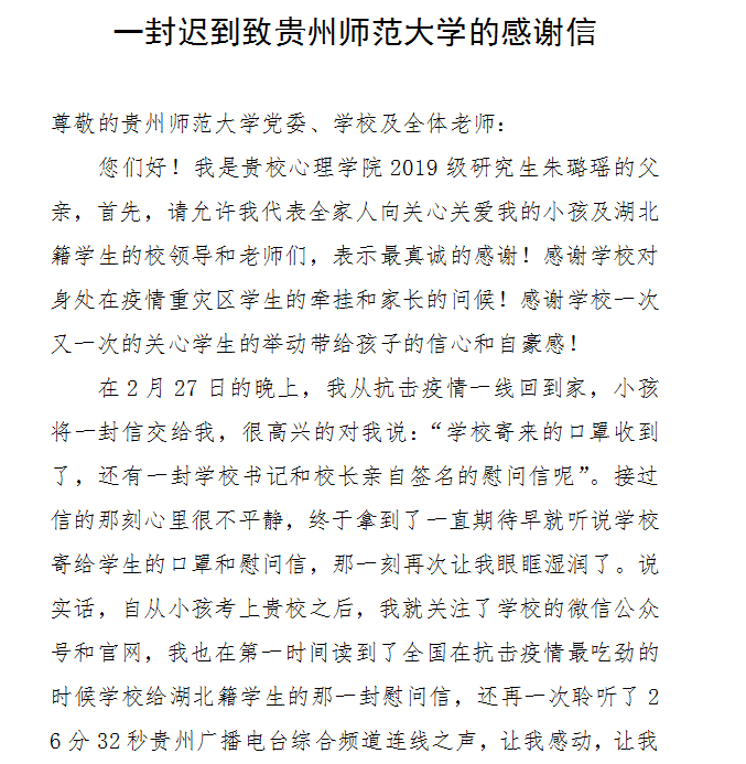 2月19日,437ccm必赢国际官网给146位在鄂学生寄去了慰问信和口罩,这一善举感动着每位师生家长。同时必赢家住湖北利川的19级研究生党员朱璐瑶随后收到了这暖心的问候,展信读信之时,全家人为此深深打动,其父亲给学校写来了一封感谢信!