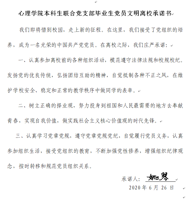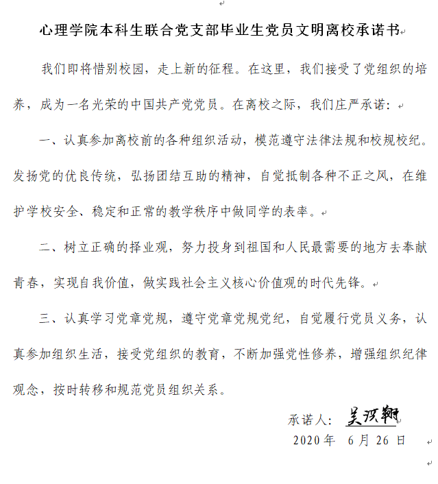 全体毕业生党员均郑重承诺,将服从安排,积极协助老师完成离校前的后续工作,按时、文明、安全、有序离校。