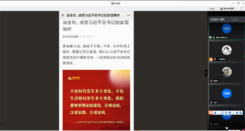 会议首先分享了支部成员于10月1日早上,线上观看天安门升旗仪式的图片;接下来,在支部书记的带领下,全体成员认真学习了习近平总书记重要讲话中撷取的金句,从中感受习总书记的家国情怀;最后支部成员们分享了作为一名新时代大学生,自己心目中的家国情怀。