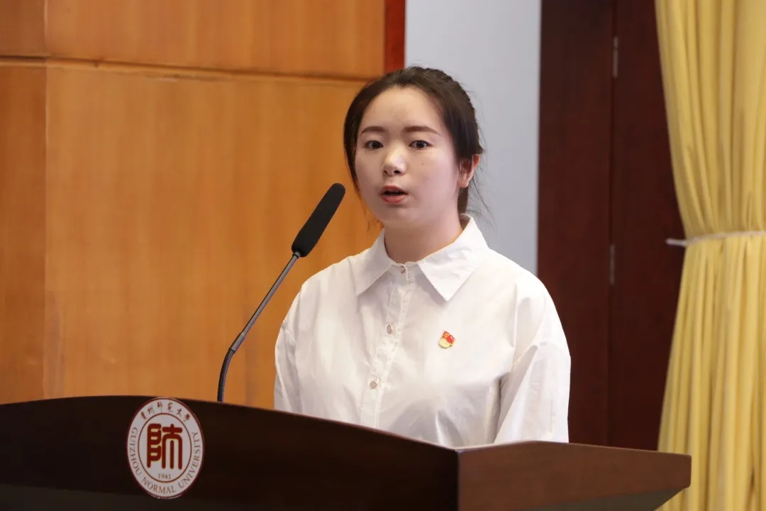 接着,2019级研究生党支部宣传委员桂腾娅同学发言。她谈到,在党支部的宣传工作中,积极发挥党员先锋模范带头作用。在党史学习教育宣讲中,深刻领悟党的先进性和纯洁性。她庄严承诺,作为党员,决不辜负党组织的殷切期望,将以实际行动证明自己无愧于共产党员的光荣称号。并代表学生党员向建党百年华诞献上深深的祝福和崇高的敬意。