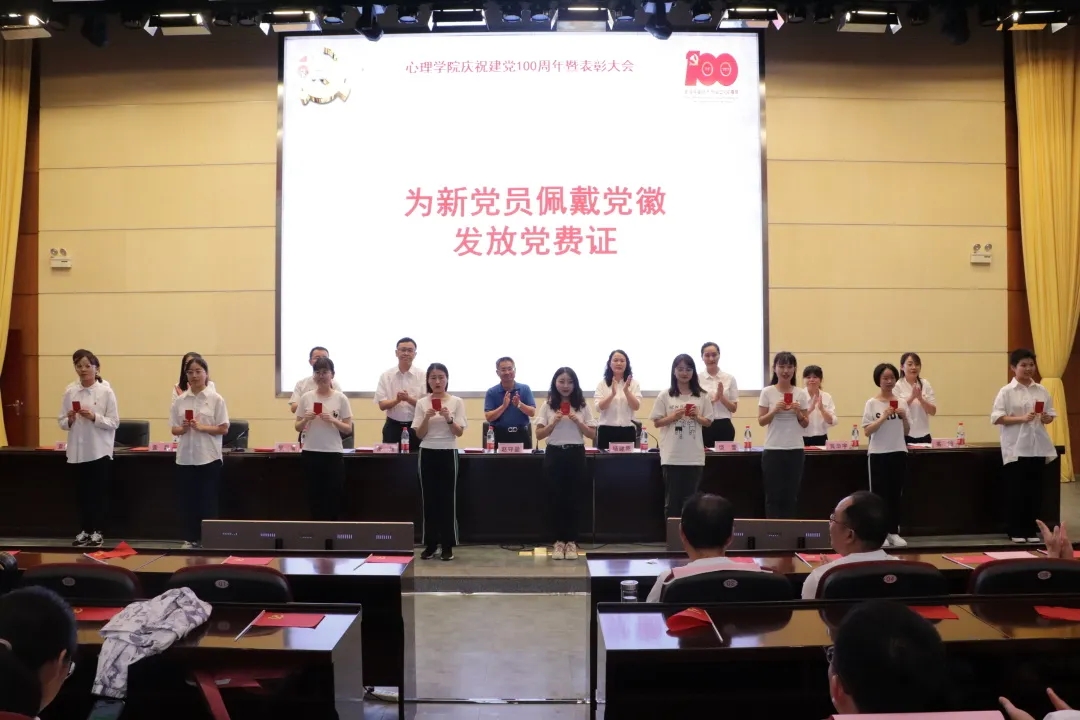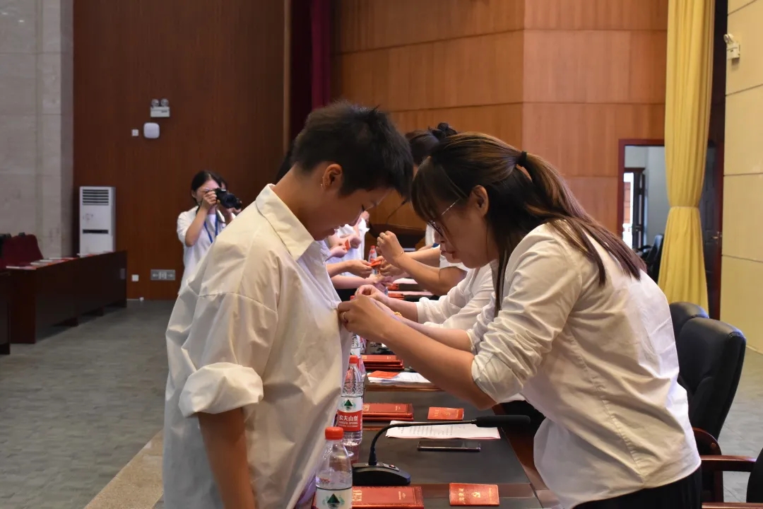 会上,饶蕾宣读了本年度预备党员按期转为中共正式党员以及接收为中共预备党员名单,随后老党员为新党员佩戴党徽、发放党费证。