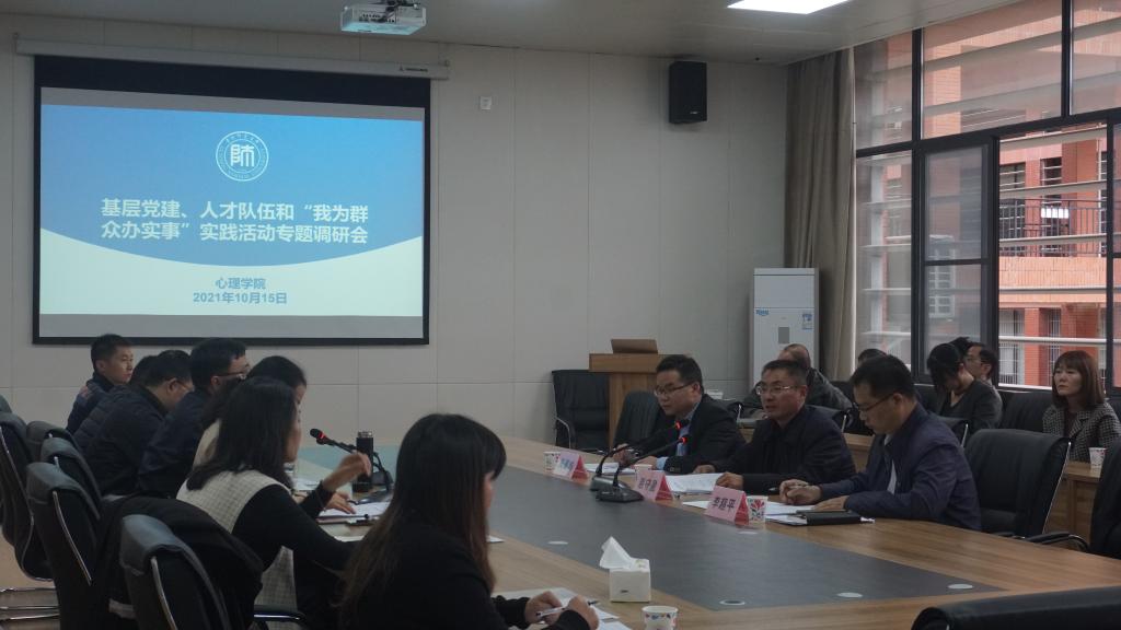 为贯彻落实《中国共产党普通高等学校基层组织工作条例》《中国共产党统一战线工作条例》等党内法规和全省教育高质量发展大会等精神,深入了解各学院党委(党总支)基层党组织建设、人才队伍建设、党史学习教育、统一战线等工作开展情况,10月15日下午,由校党委委员、副校长赵守盈任组长,人事处副处长李超平,组织部吴展城任组员的学校第四调研组,来到437ccm必赢国际官网就基层党建、人才队伍建设和“我为群众办实事”实践活动开展情况等开展专题调研。院党委书记杨建原,院长潘运,院党委副书记饶蕾,副院长罗禹及全体教职工参会,会议由杨建原主持。