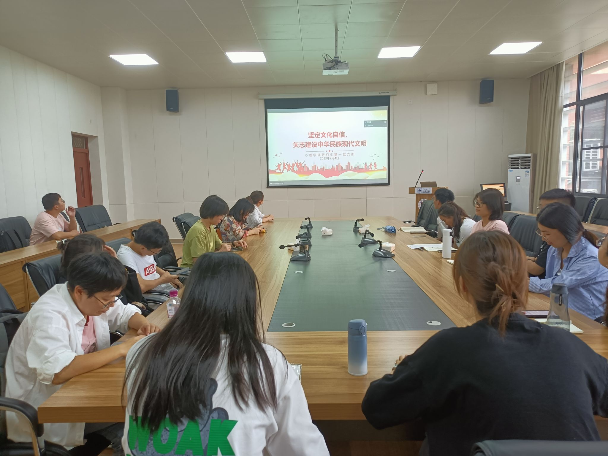 为深入开展学习贯彻习近平新时代中国特色社会主义思想主题教育,切实增强开展主题教育的思想自觉、政治自觉、行动自觉,推进主题教育走深走实。7月4日,437ccm必赢国际官网研究生第一党支部开展了主题为“坚定文化自信 矢志建设中华民族现代文明”党日活动。