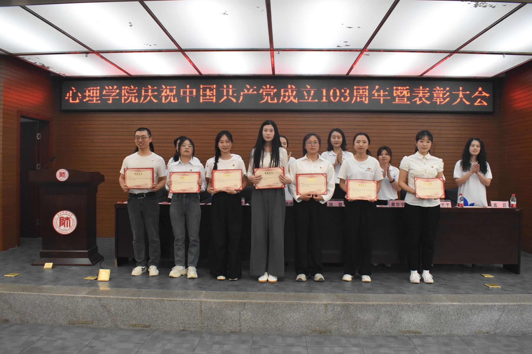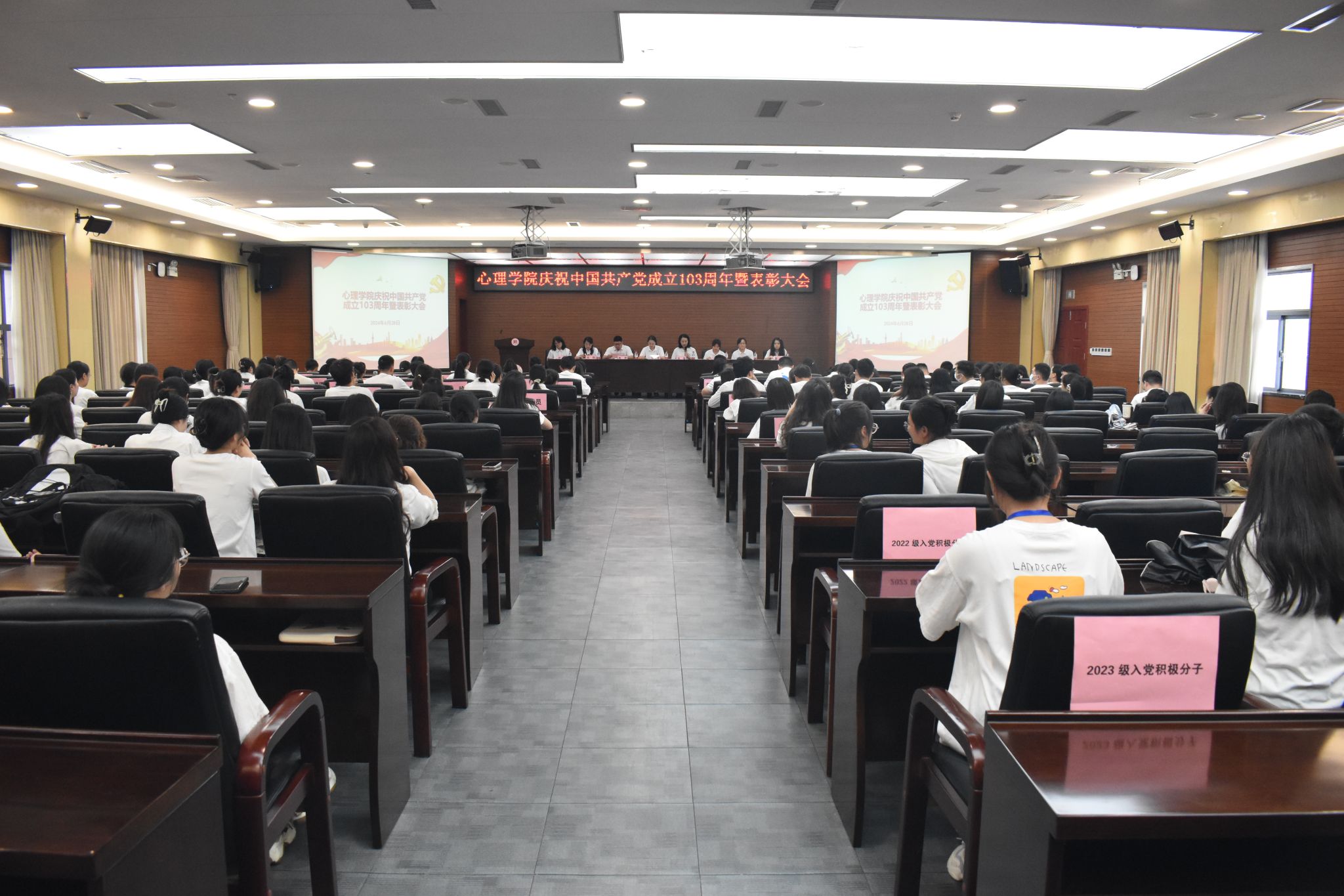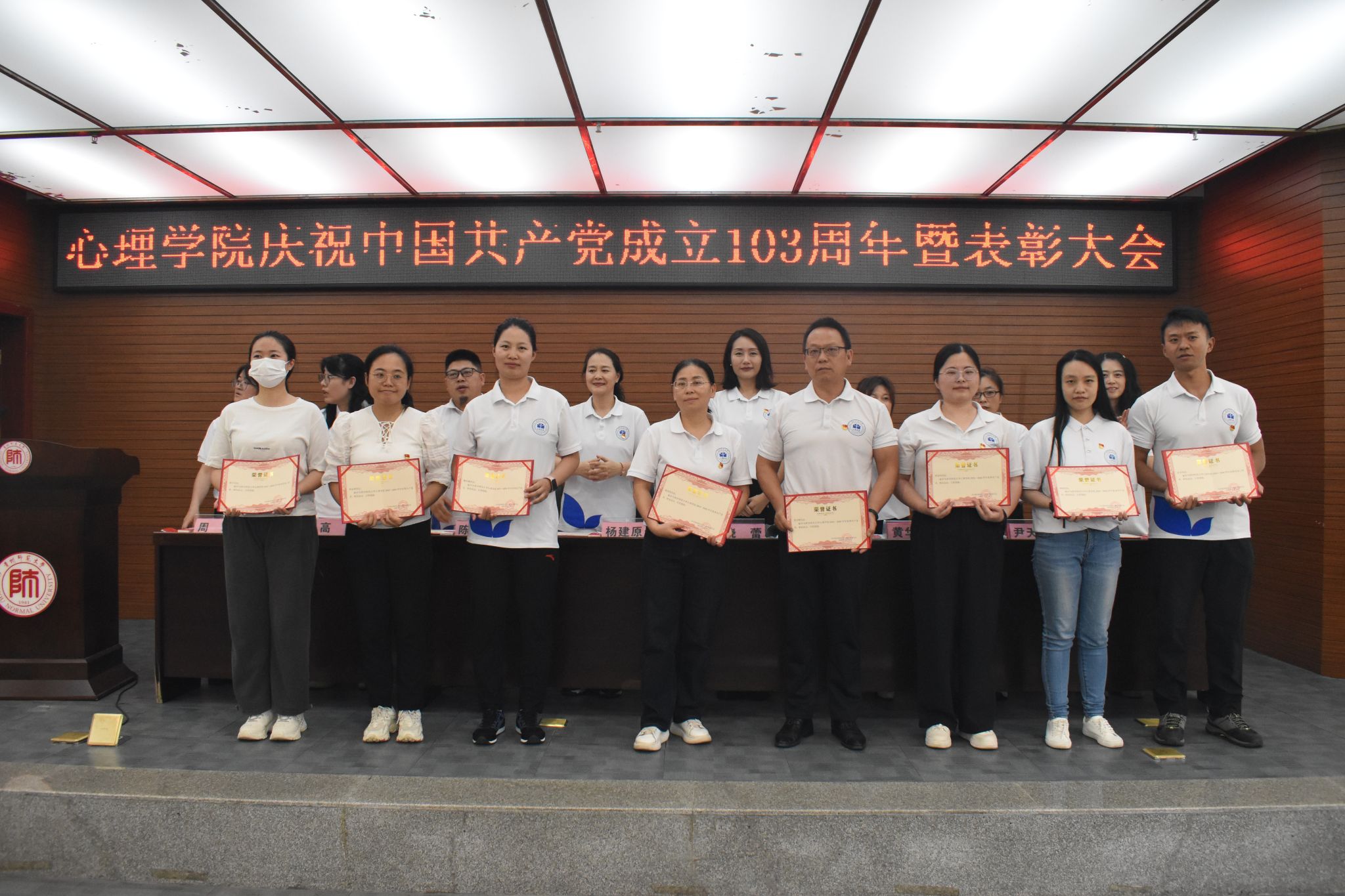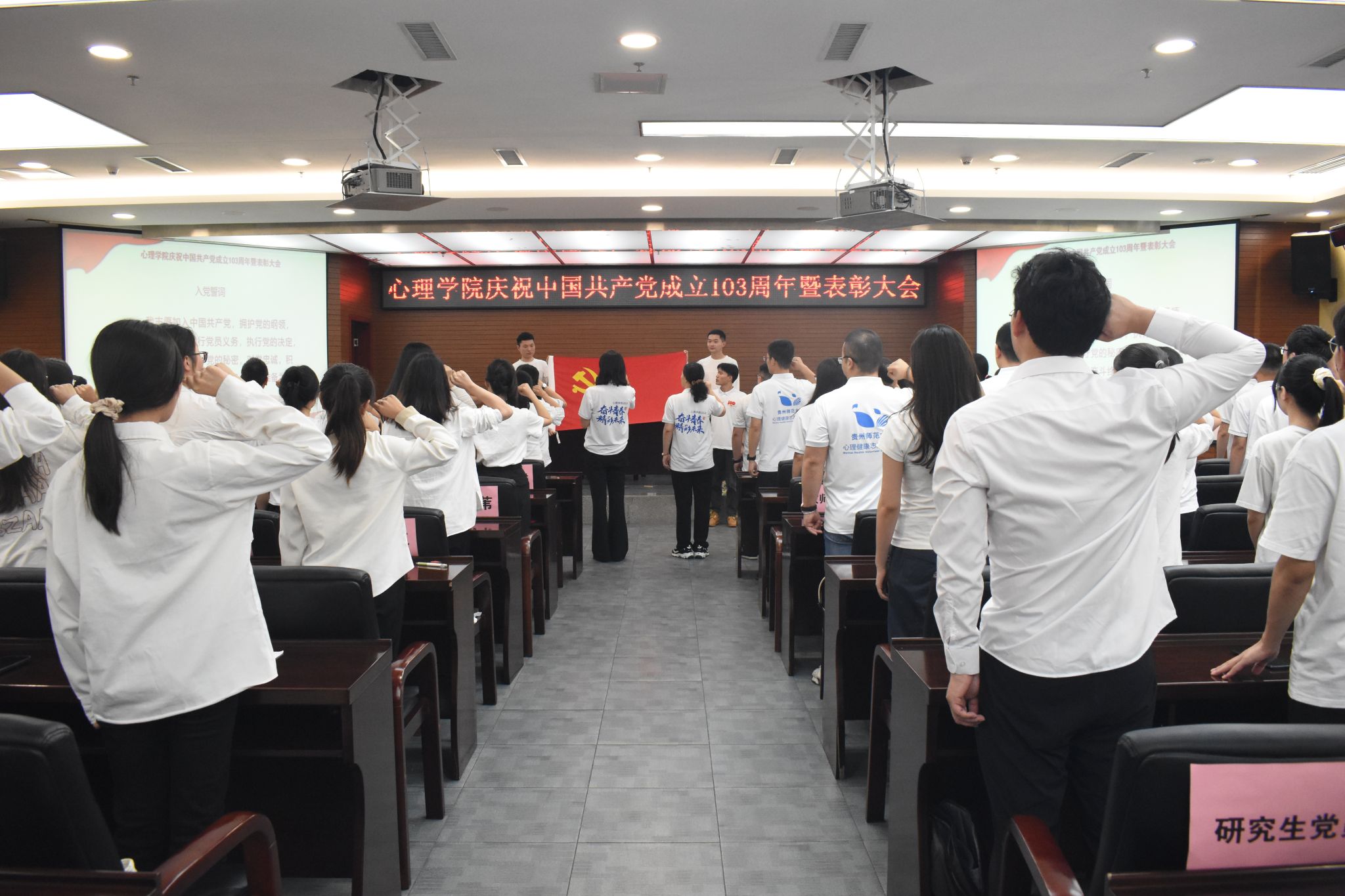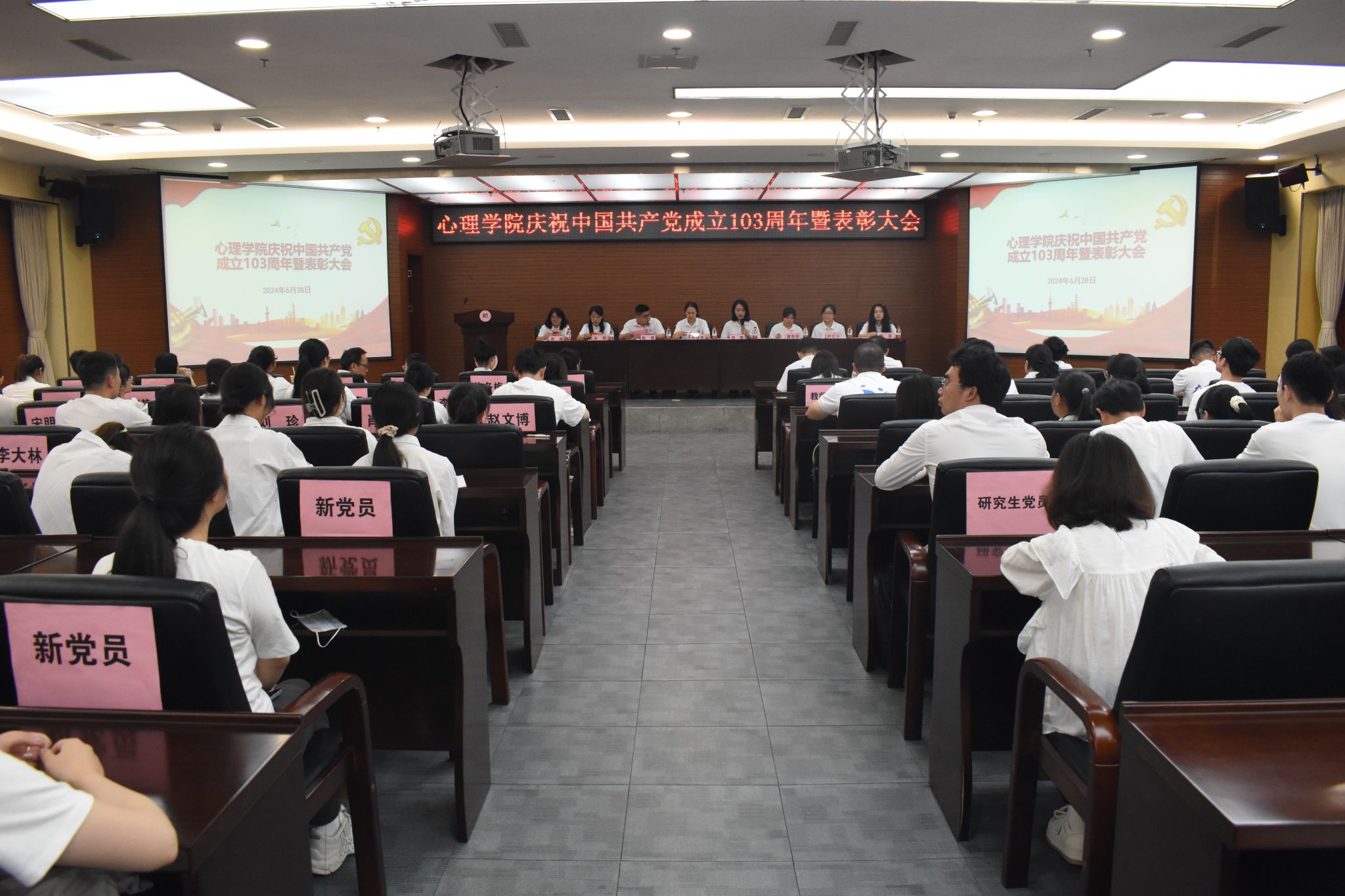 6月28日,437ccm必赢国际官网于花溪校区会议中心二楼报告厅成功召开庆祝中国共产党成立103周年暨表彰大会。437ccm必赢国际官网党委正处级组织员杨建原,党委副书记饶蕾,副院长陈维,党委委员、组织员黄华宇,团委书记高阳,教学管理科科长盖磊,心理学系副系主任、教工第一党支部书记尹天子,研究生第四党支部书记周瑗出席大会。学院全体师生党员、部分入党积极分子以及非党员师生代表参会,大会由饶蕾主持。