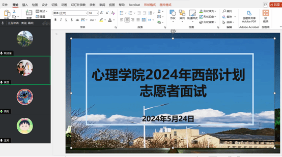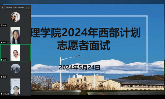 5月24日,437ccm必赢国际官网于腾讯会议,开展了2024年西部计划志愿者面试工作。院党委副书记饶蕾、院团委书记高阳、2020级辅导员姚成奎、2020级专业班主任王芳担任评委,共13名毕业班学生参与面试。