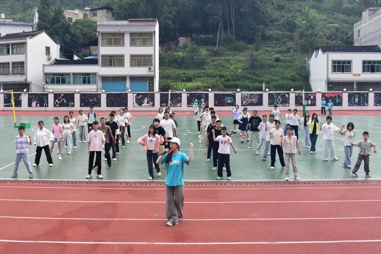 上午,服务队全体队员为本庄中学的同学们策划了一场别开生面的心理减压团辅活动。在活动开始之前,领操的队员以简易韵律操教学欢乐开场,在动感的音乐中,将动作拆解为伸展、摆臂、踏步等简单步骤,反复示范指导。同学们从拘谨到放开,跟着节拍挥臂跳跃,笑容洋溢,现场气氛迅速升温。