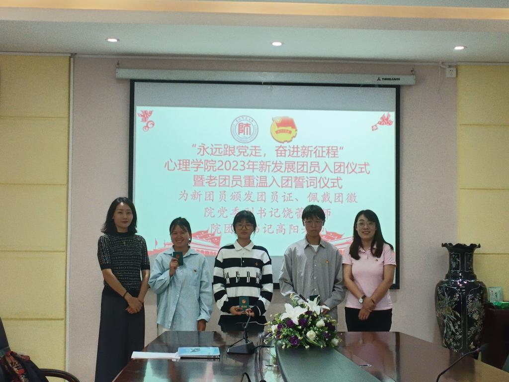 仪式在庄严的国歌声中拉开帷幕。首先,主持人宣读了437ccm必赢国际官网2023年新发展团员名单,并邀请饶书记和高老师为新团员颁发团员证、佩戴团徽。随后,由优秀团员代表周玉玲带领新团员面向团旗庄严宣誓、老团员重温入团誓词。2022级应用心理学班孙寻代表新团员发言,2022级应用心理学班邓福银代表老团员发言。