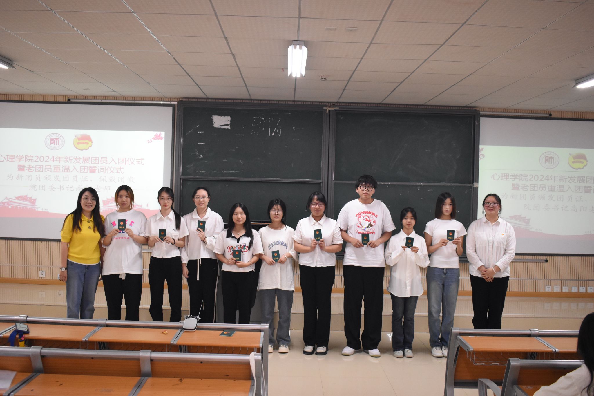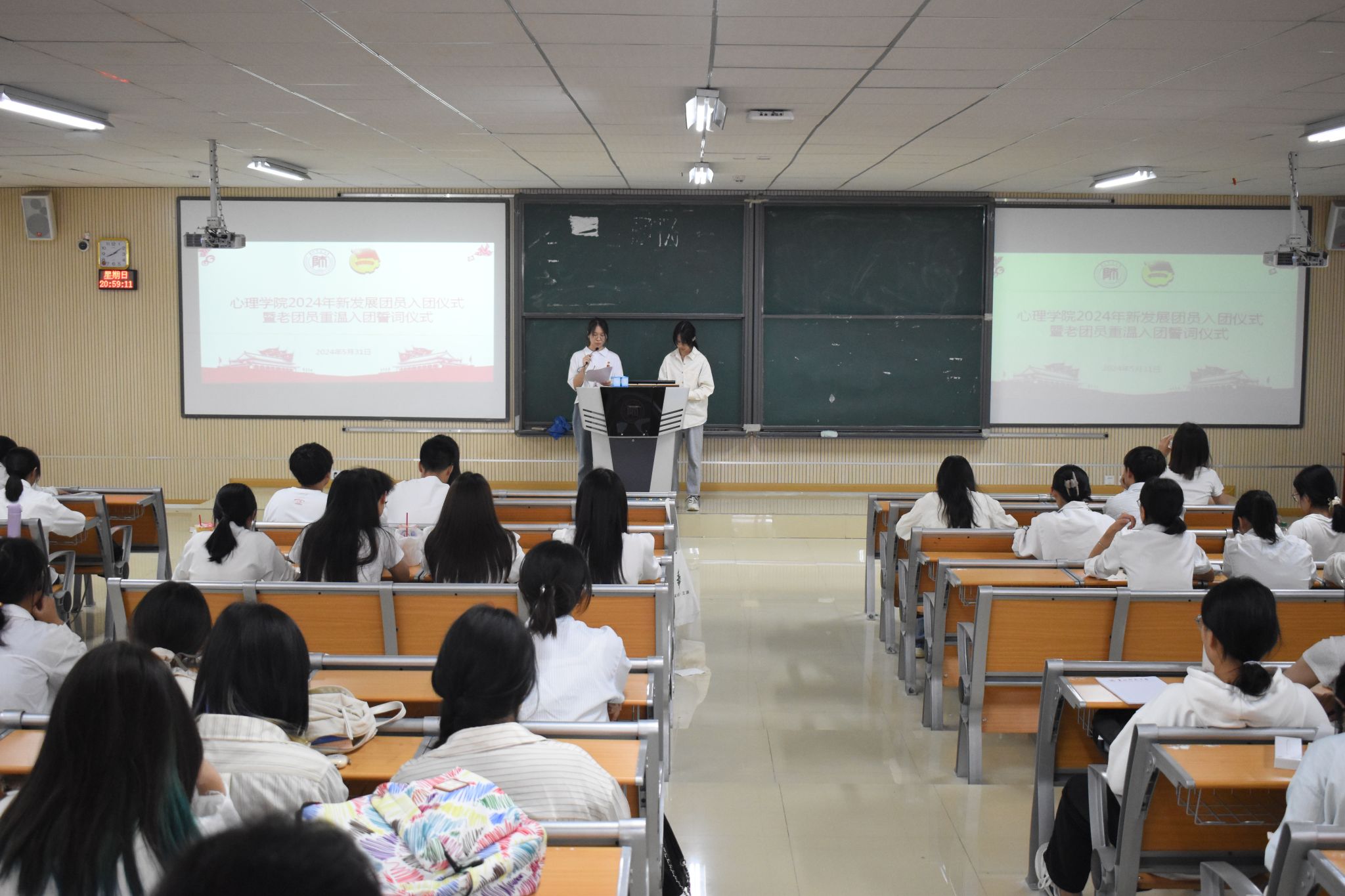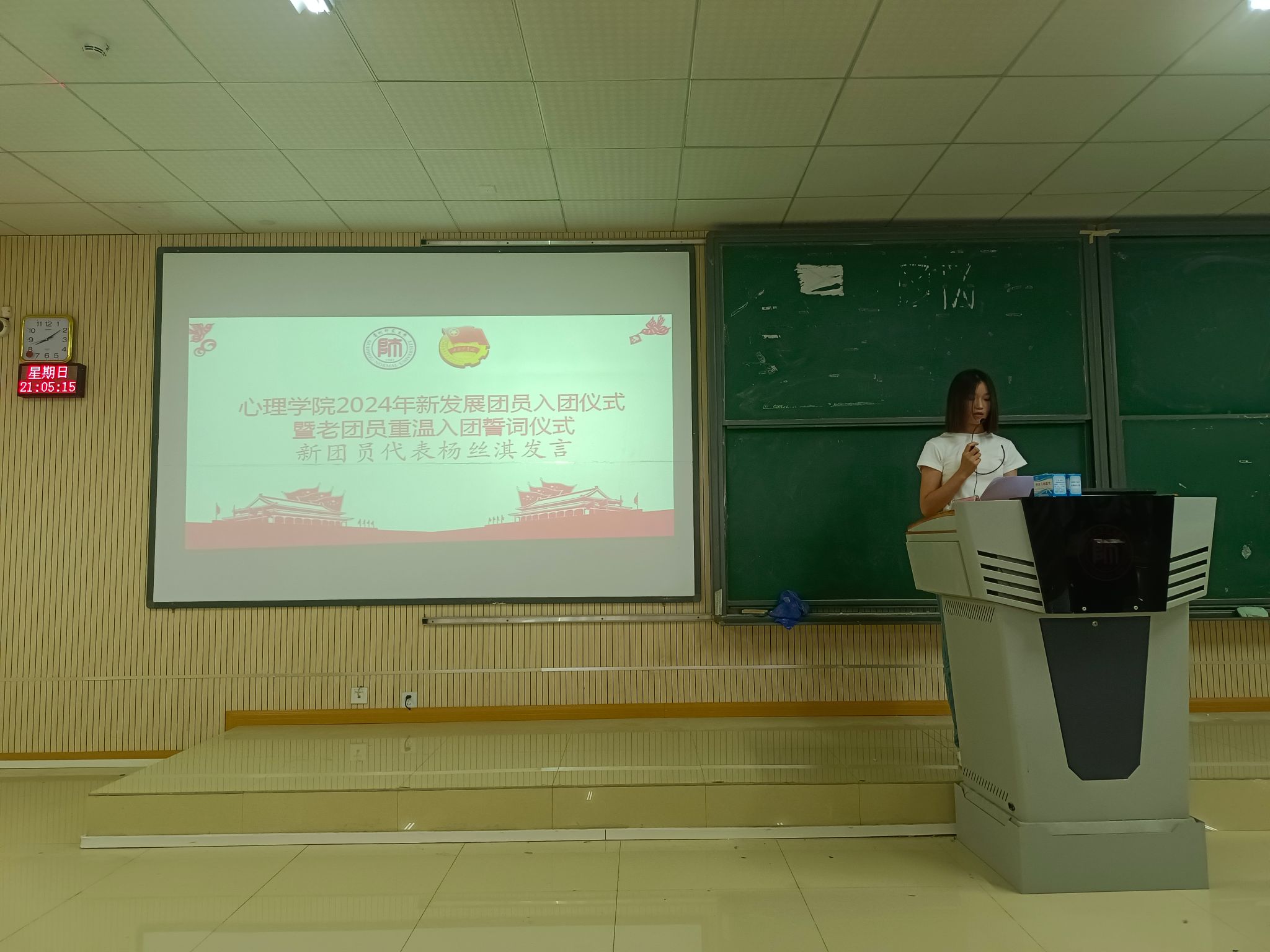 仪式在庄严的国歌声中拉开帷幕。首先,院团委副书记周玉玲宣读新发展团员名单,并邀请高老师为新团员颁发团员证及团徽。随后,举行新团员宣誓、老团员重温入团誓词仪式 ,全体青年团员面向团旗、右手握拳,在团员代表印灵蕴的带领下庄严宣誓。2023级应用心理学支部杨丝淇代表新团员发言,2023级应用心理学支部侯霁珊代表老团员发言。