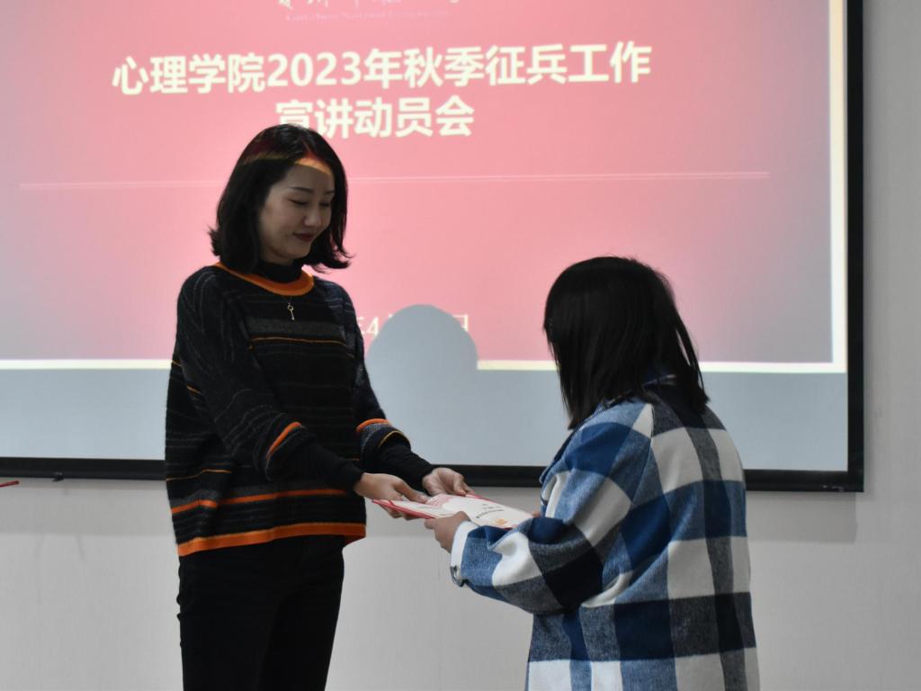 随后,饶蕾老师为各班义务征兵宣传员颁发了聘书,对他们为学院征兵工作的辛苦付出表示感谢,同时鼓励他们继续为院征兵工作做贡献。饶老师认为,青年学生有理想、有担当,国家就有前途,大学生应征入伍不仅仅是响应国家政策,同时也是达成理想,到达成功的另一条途径,她鼓励必赢男生积极锻炼,积极响应征兵号召。